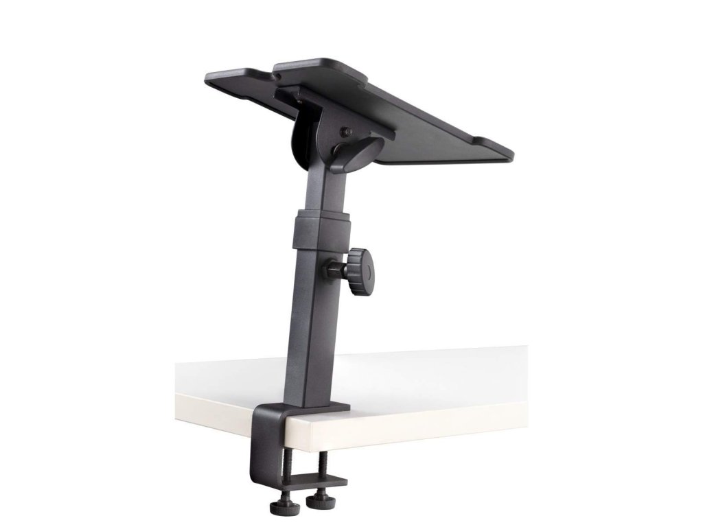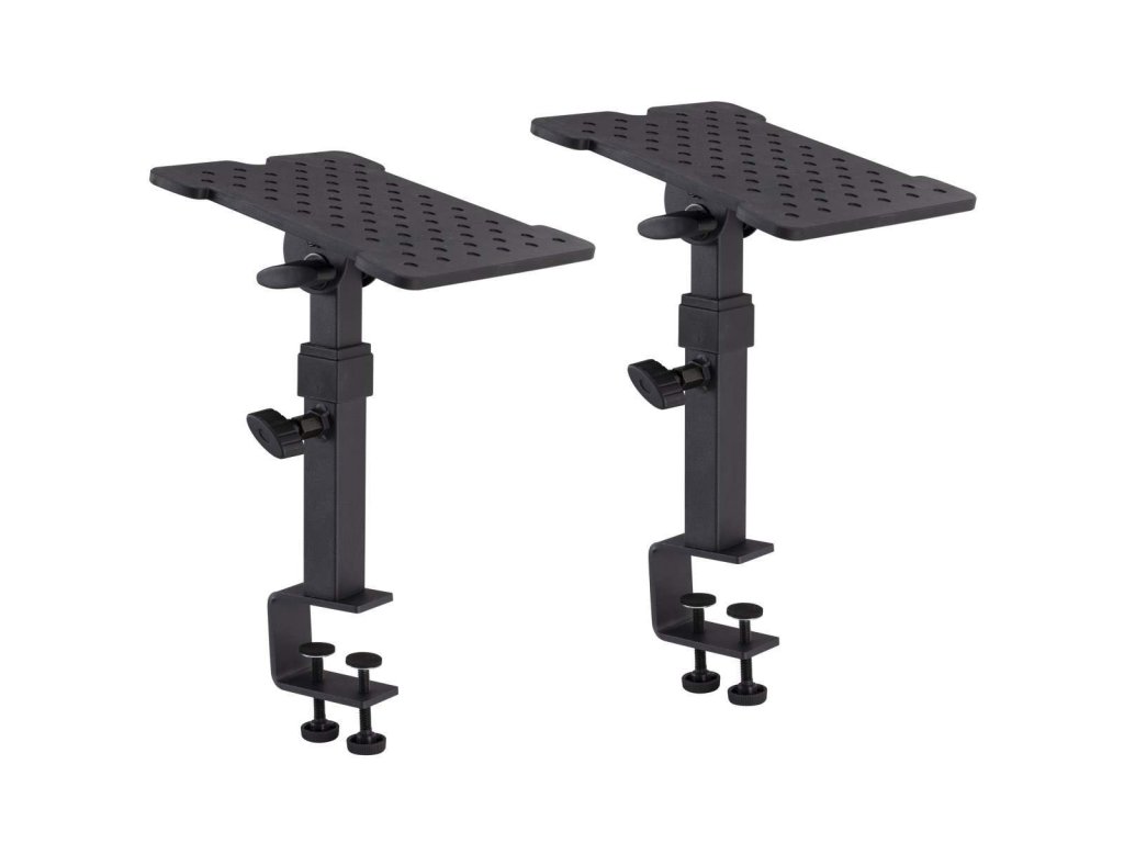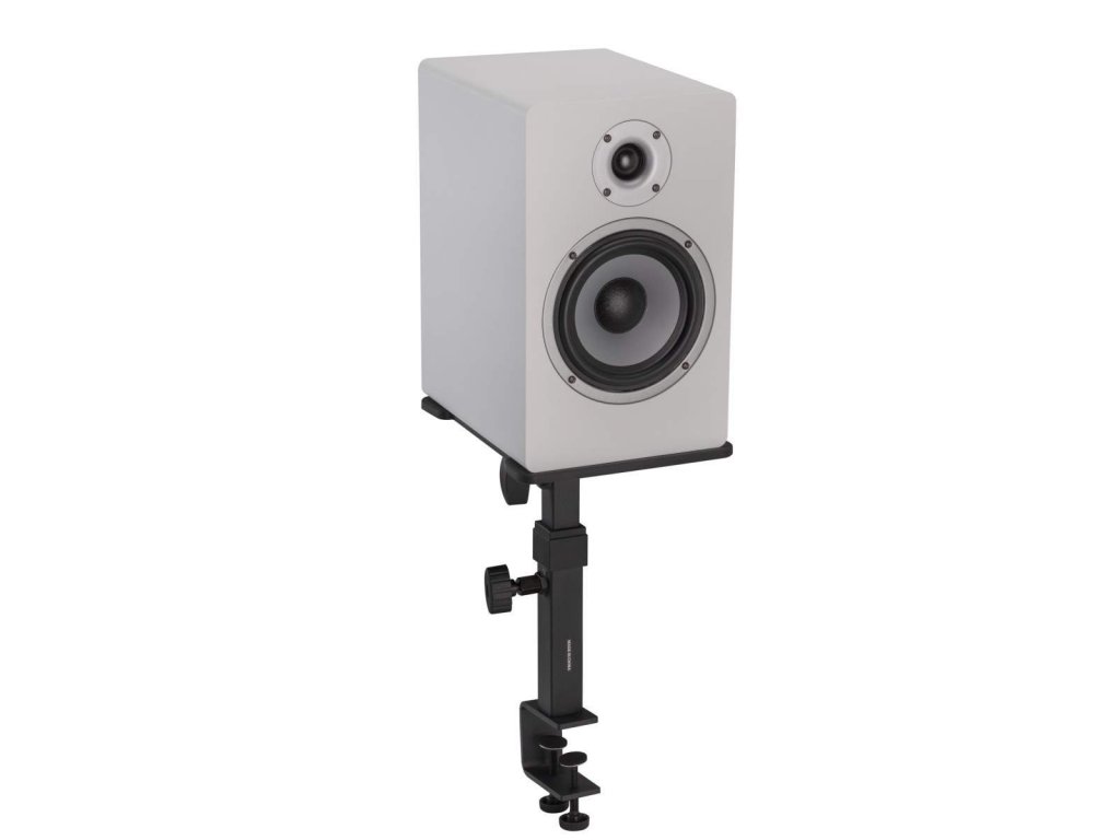 Uniwersalny stojak stołowy odpowiedni do monitorów studyjnych i głośników. Uniwersalny stojak stołowy odpowiedni do monitorów studyjnych i głośników. Stojak posiada podstawę z gumowaną powierzchnią, dwa gwinty do mocowania do blatu o wysokości do 50 mm, regulowaną wysokość i nachylenie dla szczegółowej regulacji monitora podczas nagrywania, miksu, krytycznego odsłuchu lub finalnego masteringu.