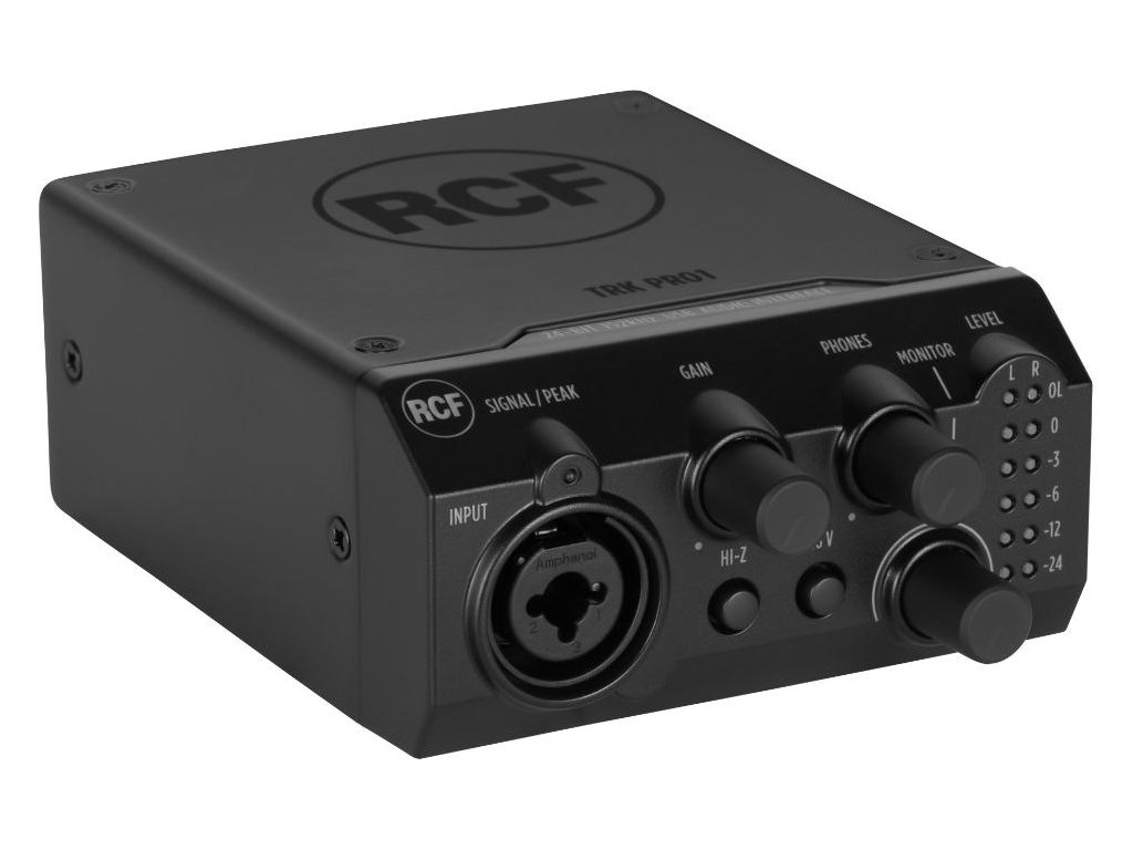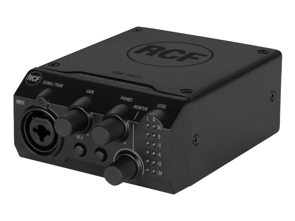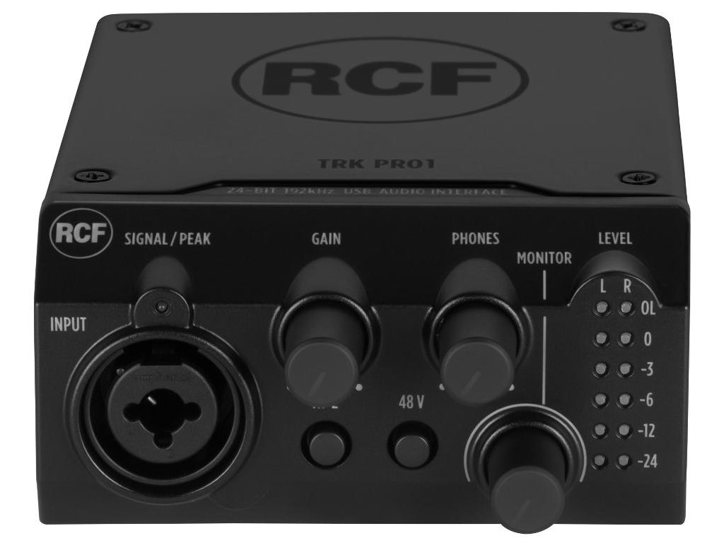 Interfejs sprzętowy RCF TRK PRO1 oferuje w solidnej i dobrze zaprojektowanej obudowie USB 2.0 kompleksowe możliwości podłączenia mikrofonów, instrumentów muzycznych lub źródeł sygnałów liniowych do komputera z systemem Mac lub Windows. Wewnętrzny liniowy obwód przedwzmacniacza umożliwia podłączenie mikrofonów z zasilaniem phantom 48 V, a także instrumentów muzycznych o wysokim poziomie wyjściowym (Hi-Z). Sygnał audio może być kierowany do DAW (Digital Audio Workstation) w rozdzielczości do 24-bit/192 kHz. Interfejs można podłączyć do wzmacniacza i głośników, aktywnych monitorów, słuchawek, analogowego miksera lub dowolnego innego analogowego urządzenia audio.