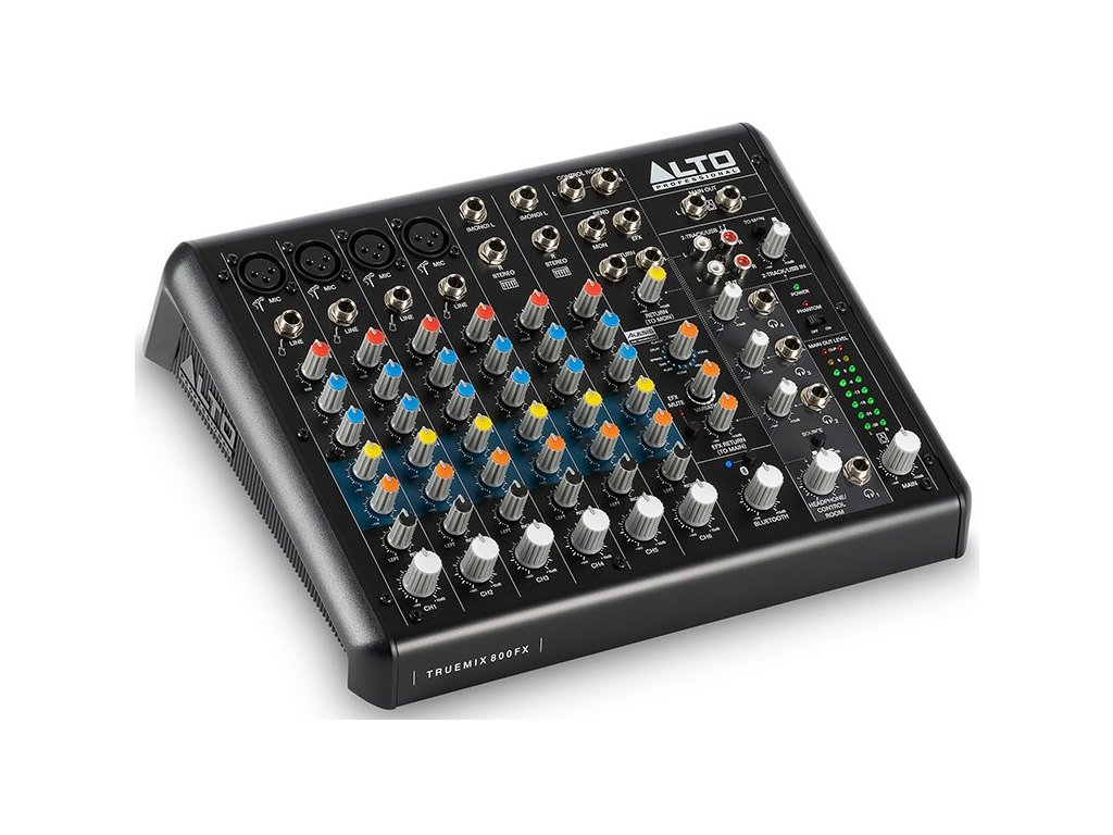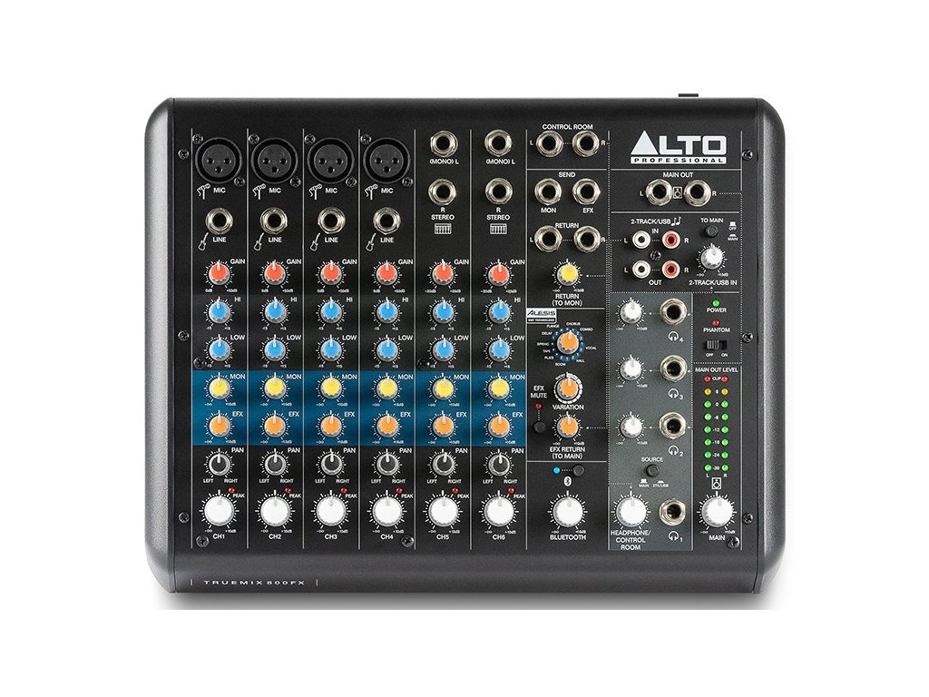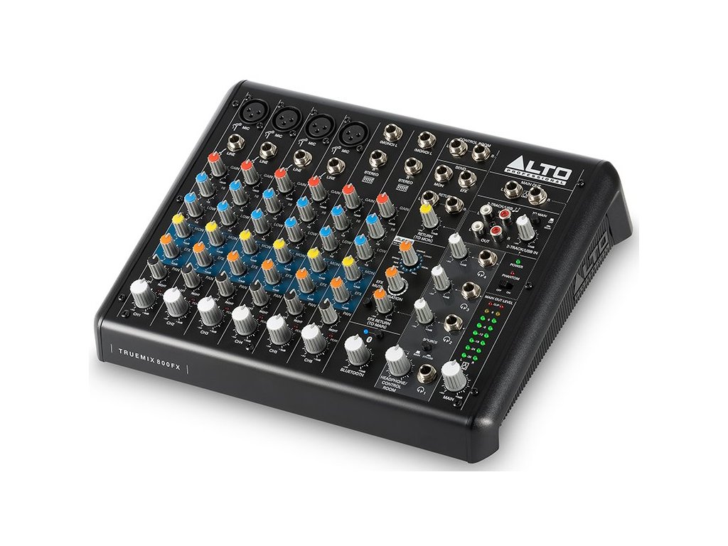 Alto Professional TrueMix 800 FX to przenośny mikser audio z wbudowanymi efektami DSP, który zapewnia wszystkie podstawowe funkcje potrzebne do nagrywania w domu, transmisji na żywo, podcastów lub występów. TrueMix 800 FX jest wyposażony w 16 efektów, takich jak chorus, flange oraz szereg wysokiej jakości efektów delay i reverb. TrueMix 800 FX jest wyposażony w specjalny kanał Bluetooth do łatwego strumieniowania z urządzeń osobistych. Kanał Bluetooth obsługuje również parowanie z telefonem bez sprzężenia zwrotnego dzięki wykorzystaniu technologii mix-minus, co jest funkcją, której nie obsługuje żadna inna seria mikserów audio tej klasy.Dostępnych jest 8 analogowych wejść z obwodami o wysokiej przepustowości, zapewniającymi minimalny szum i obcinanie sygnału. 4 kanały wejściowe dla mikrofonów oferują złącza XLR, które świetnie nadają się do podłączania mikrofonów dynamicznych lub mikrofonów pojemnościowych z zasilaniem phantom 48V. Kanały te posiadają również symetryczne wejścia liniowe 6,3 mm Jack do podłączania instrumentów i innych urządzeń. Dostępne są również 2 stereofoniczne kanały wejściowe, każdy z dwoma symetrycznymi wejściami 6,3mm Jack TRS. Wejścia te są idealne dla źródeł dźwięku o charakterze liniowym. Wszystkie kanały są wyposażone w 2-pasmowy korektor z kolorowo oznaczonymi pokrętłami, które ułatwiają ustawienie doskonałego dźwięku podczas pracy w słabych warunkach oświetleniowych. Podłączenie TrueMix 800 FX do komputera jest również błyskawiczne, dzięki możliwości podłączenia plug and play w systemach Windows i macOS. TrueMix 800 FX to doskonały towarzysz do miksowania dźwięku i nagrywania w podróży.