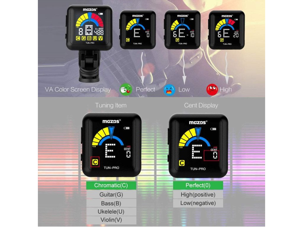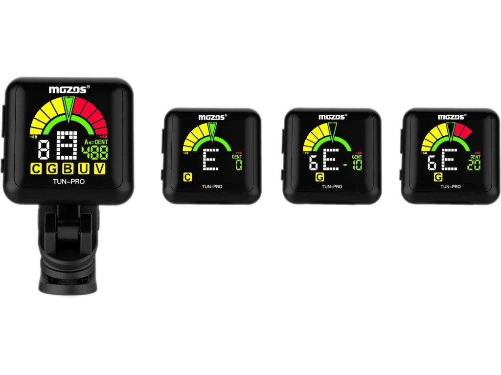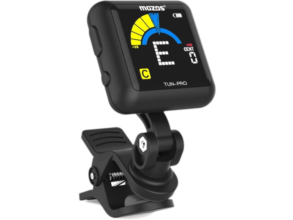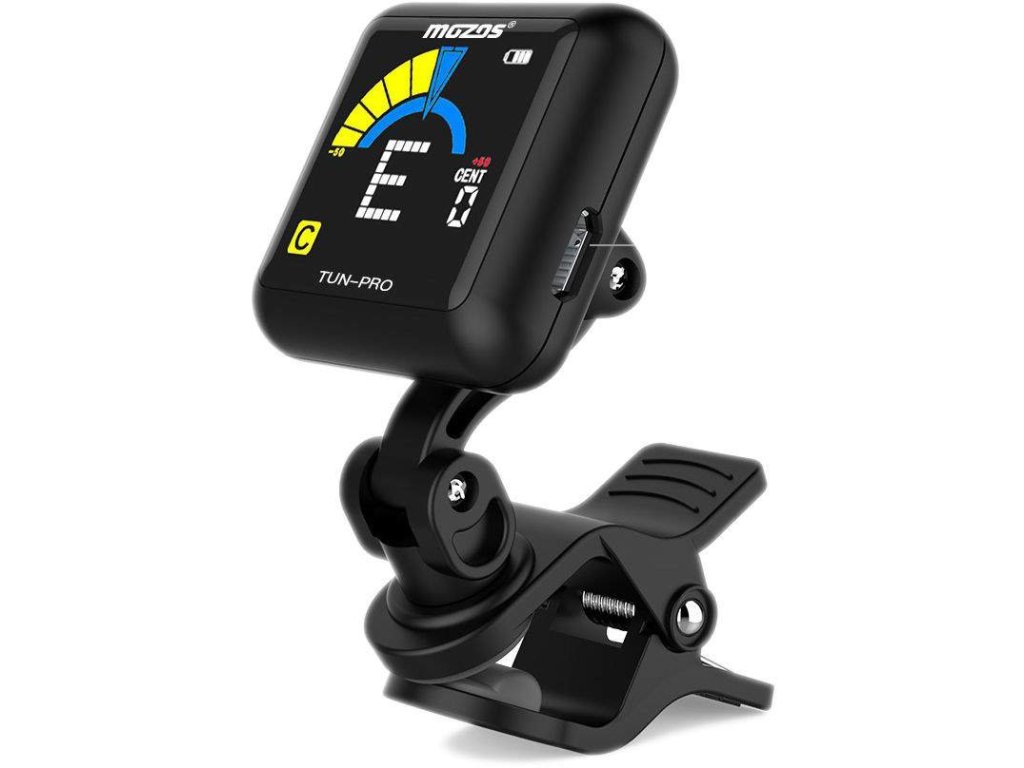 Ulepszony model klipsowego tunera Mozos Tun-Pro oferuje w porównaniu z tradycyjnymi tunerami szybsze i bardziej precyzyjne strojenie, bardziej przejrzysty wyświetlacz, a przede wszystkim wbudowany akumulator. Nie musisz nosić ze sobą zapasowych baterii ani martwić się o ich żywotność – do ładowania wystarczy zwykły kabel micro USB, a po jednym naładowaniu tuner może działać do 6 godzin. Aby oszczędzać baterię, tuner jest wyposażony w funkcję automatycznego wyłączania po trzech minutach bezczynności. Tuner jest odpowiedni do większości instrumentów strunowych, a w jego wyposażeniu oprócz tradycyjnego trybu chromatycznego znajdują się również specjalne tryby dla gitary, gitary basowej, ukulele lub skrzypiec. W razie potrzeby możesz również skorzystać z ustawienia częstotliwości A kamertonu w zakresie 430 – 450 Hz.