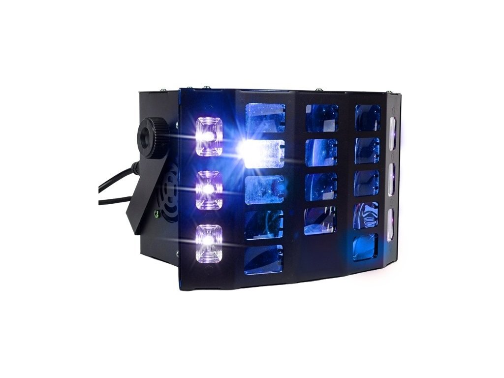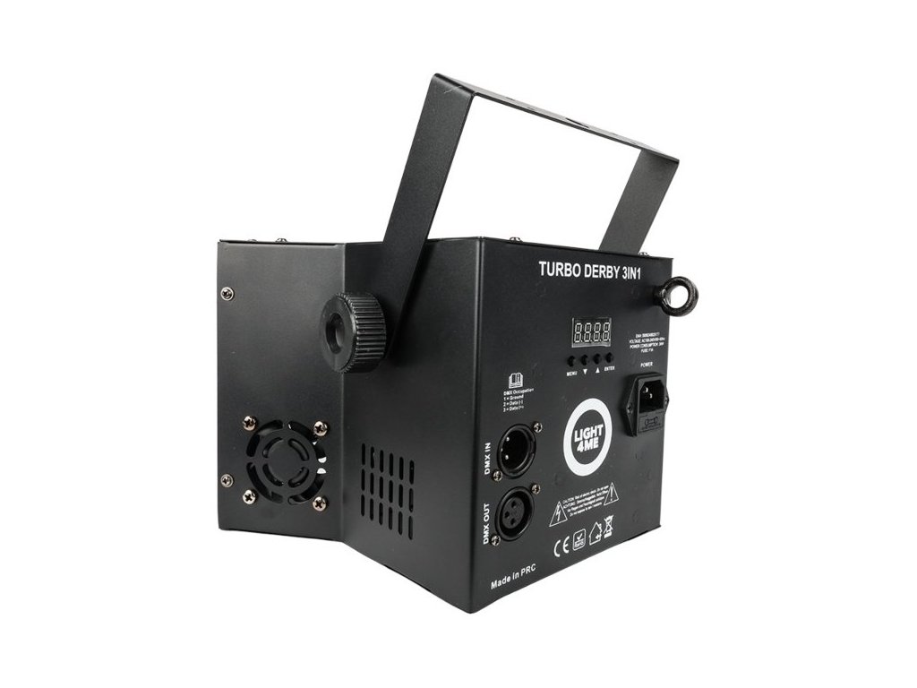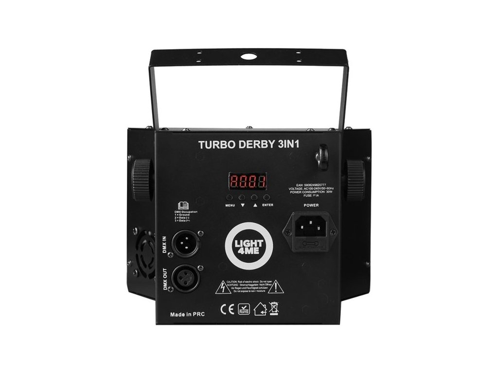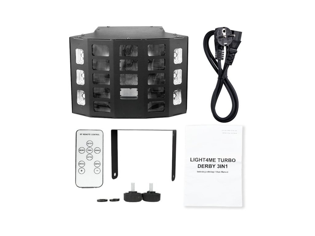 LIGHT4ME TURBO DERBY 3IN1 to RGBW-UV LED świetlny multiefekt. Dzięki wydajnemu źródłu światła, które składa się z dwóch diod LED RGBW po 15 W i sześciu diod LED UV+W po 6 W, oferuje jasne i przyciągające wzrok efekty wizualne, które zadowolą nawet najbardziej wymagających użytkowników. Dzięki niskiemu zużyciu energii urządzenie jest energooszczędne, co jest ważną zaletą podczas długotrwałych imprez. Wąski kąt świecenia umożliwia doskonałe oświetlenie wybranych obszarów, co jest nieocenione w miejscach takich jak małe kluby i sale weselne.