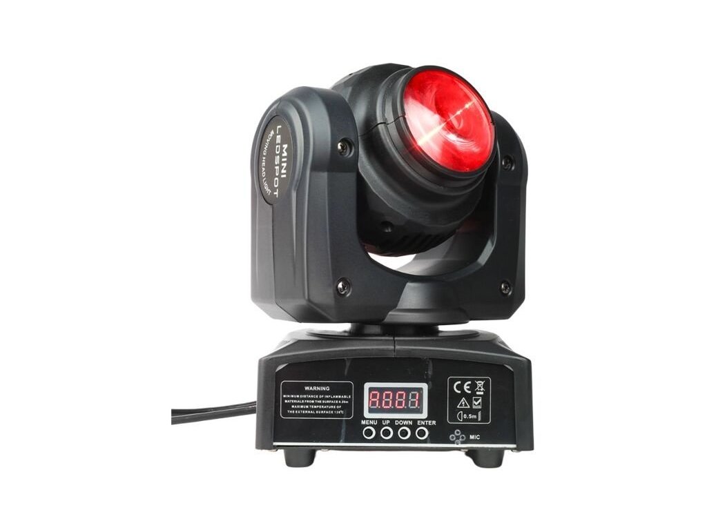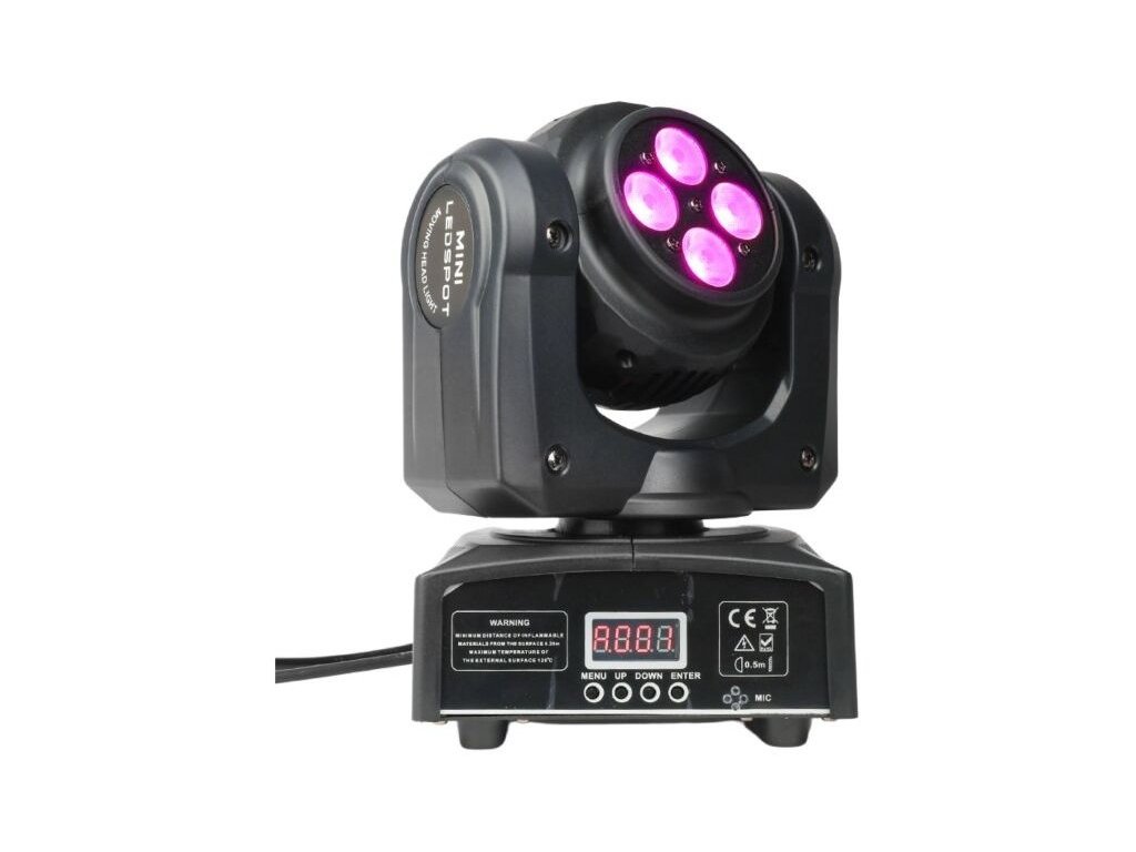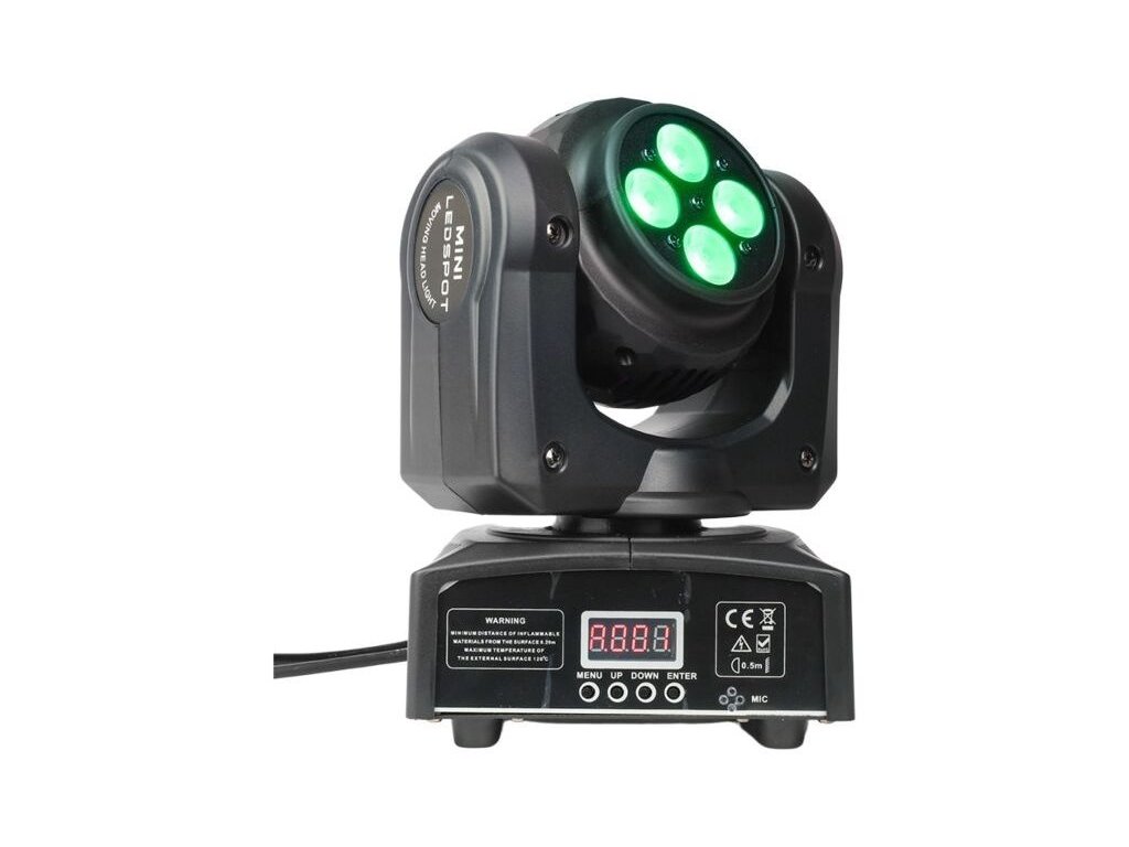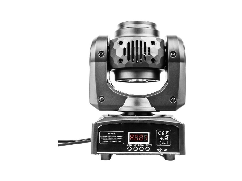Elementy ruchomej głowicy LED są zamknięte w lekkiej obudowie z tworzywa sztucznego. Stopień ochrony IP30 chroni urządzenie przed wnikaniem ciał stałych o średnicy 2,5 mm i większych. Z tyłu znajduje się gniazdo zasilania IEC oraz trzypinowe wejście i wyjście XLR do sterowania urządzeniem za pomocą protokołu DMX. Wystarczające chłodzenie zapewniają ciche wentylatory, dzięki czemu urządzenie nie generuje niepotrzebnego hałasu. Z przodu znajduje się panel sterowania w postaci cyfrowego wyświetlacza LCD i czterech przycisków. Za ich pomocą możemy dokonywać zmian w ustawieniach menu, a także wybrać jeden z czterech trybów pracy urządzenia: