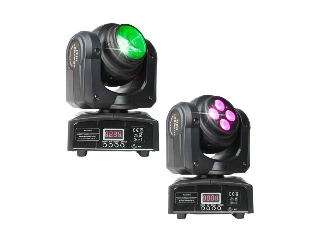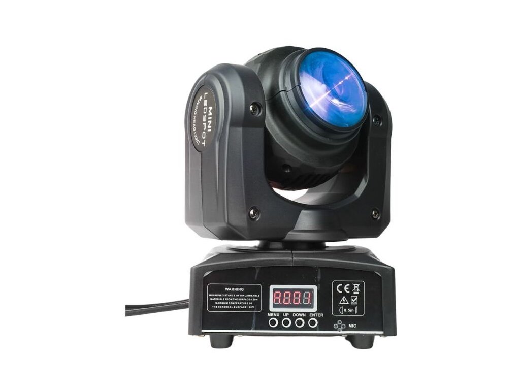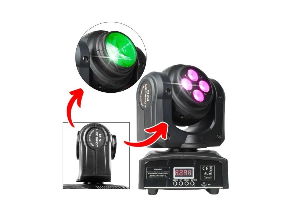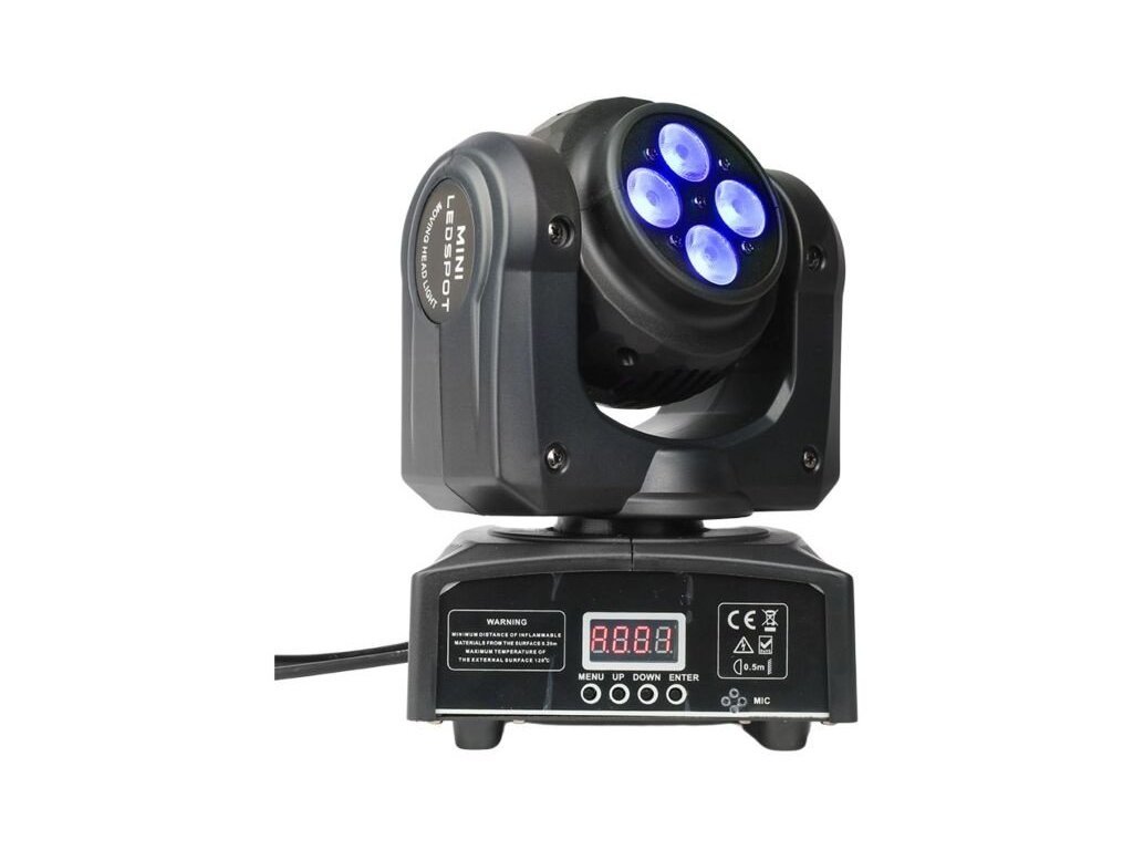 Elementy ruchomej głowicy LED są zamknięte w lekkiej obudowie z tworzywa sztucznego. Stopień ochrony IP30 chroni urządzenie przed wnikaniem ciał stałych o średnicy 2,5 mm i większych. Z tyłu znajduje się gniazdo zasilania IEC oraz trzypinowe wejście i wyjście XLR do sterowania urządzeniem za pomocą protokołu DMX. Wystarczające chłodzenie zapewniają ciche wentylatory, dzięki czemu urządzenie nie generuje niepotrzebnego hałasu. Z przodu znajduje się panel sterowania w postaci cyfrowego wyświetlacza LCD i czterech przycisków. Za ich pomocą możemy dokonywać zmian w ustawieniach menu, a także wybrać jeden z czterech trybów pracy urządzenia:
