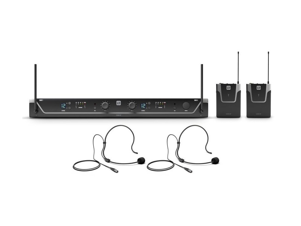 Podwójny bezprzewodowy system mikrofonowy z 2 x bodypack i 2 x zestawem nagłownym - 863 - 865 MHz + 823 - 832 MHz.