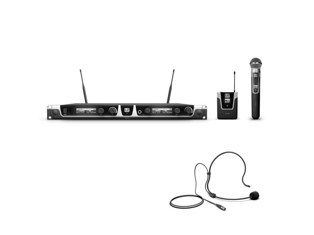 Bezprzewodowy system z nadajnikiem bodypack, mikrofonem nagłownym i mikrofonem ręcznym.