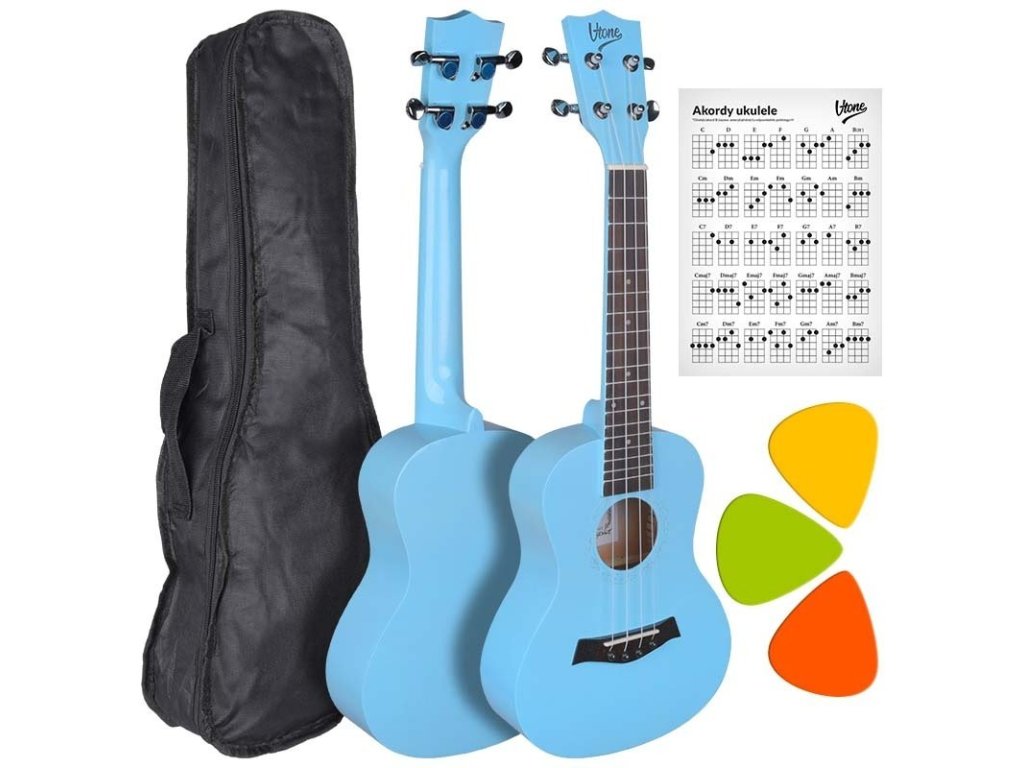 - Zawartość zestawu: Ukulele, pokrowiec ochronny, 3 kostki, akordy