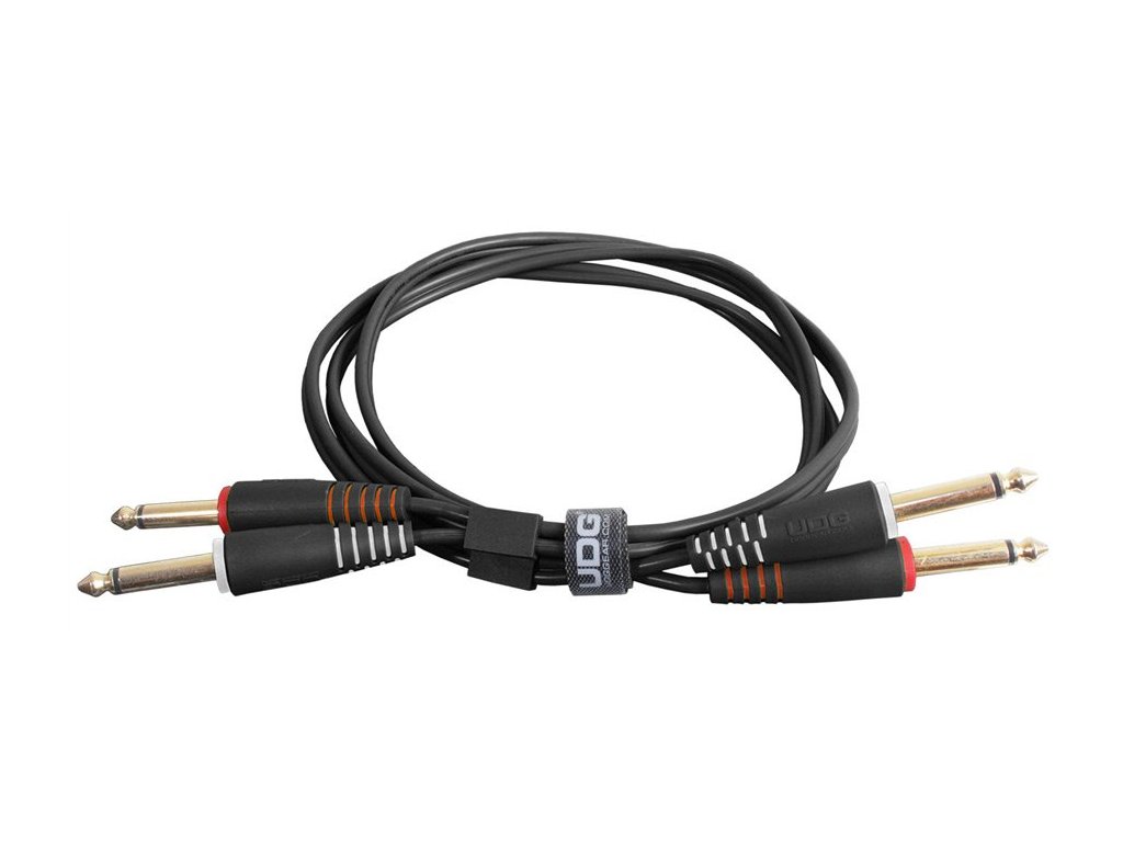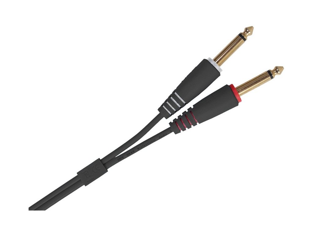 Podwójny kabel audio ze złączami TS 6,3 mm (duży jack) do podłączania urządzeń DJ, profesjonalnych i komercyjnych, pozłacane styki złączy, wysokiej jakości ekranowanie, odporność mechaniczna, kolor czarny.