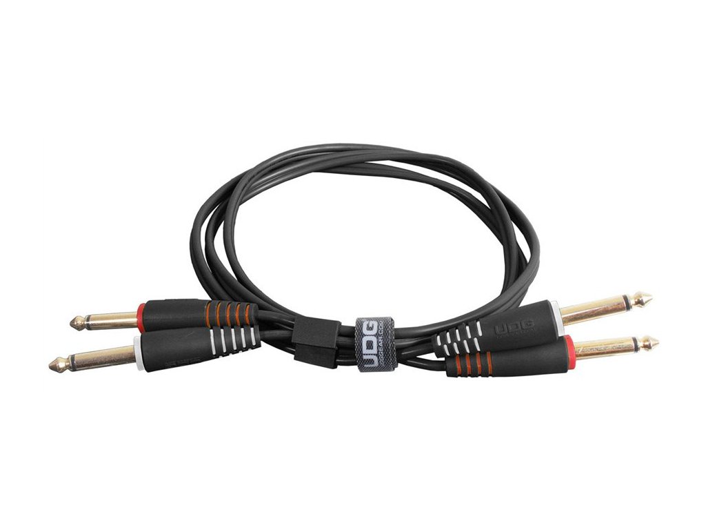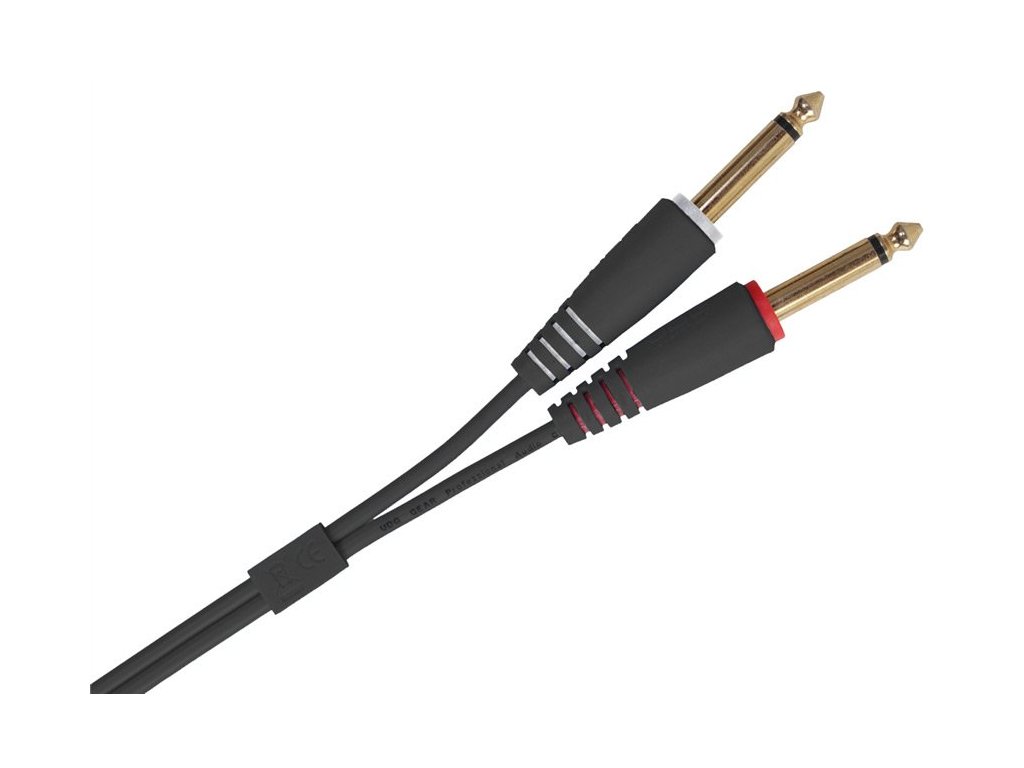 Podwójny kabel audio ze złączami TS 6,3 mm (duży jack) do podłączania urządzeń DJ, profesjonalnych i komercyjnych, pozłacane styki złączy, wysokiej jakości ekranowanie, odporność mechaniczna, kolor czarny.