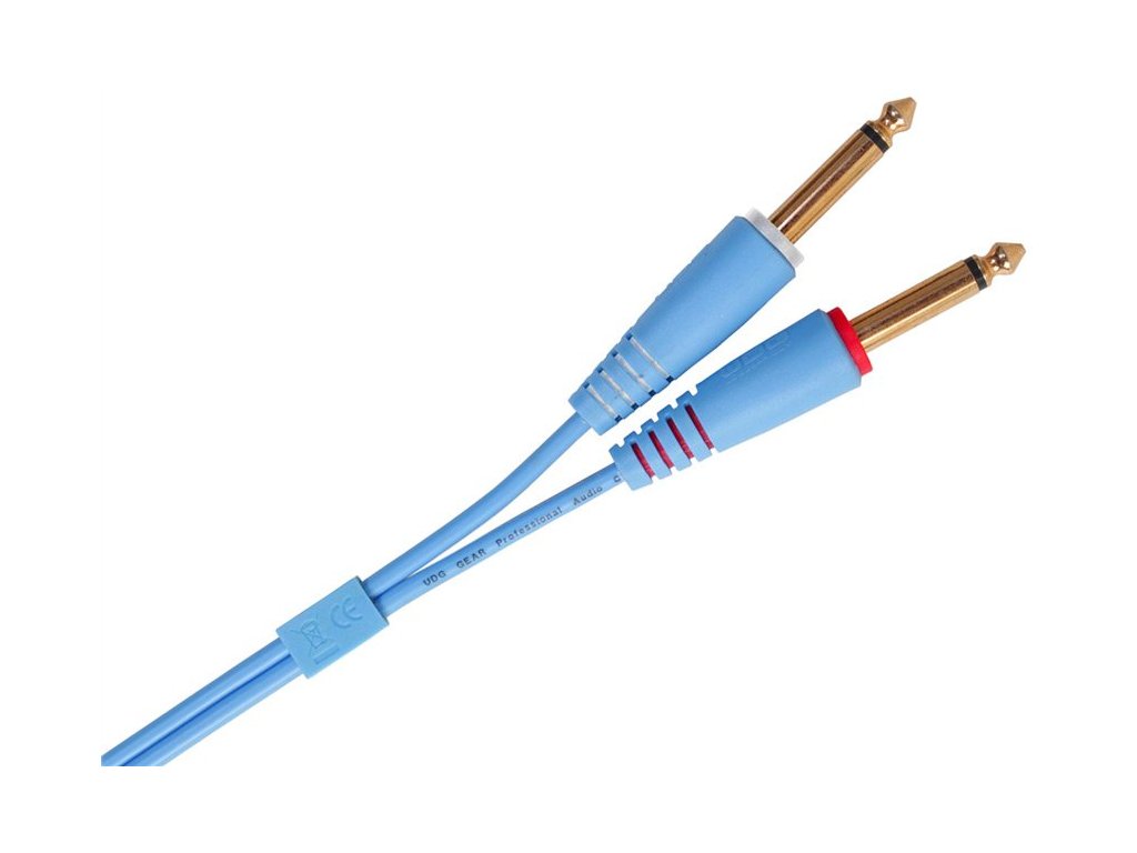 Podwójny kabel audio z wtykami TS 6,3 mm (duży jack) do podłączania urządzeń DJ, profesjonalnych i komercyjnych, pozłacane styki wtyków, wysokiej jakości ekranowanie, odporność mechaniczna, kolor niebieski.