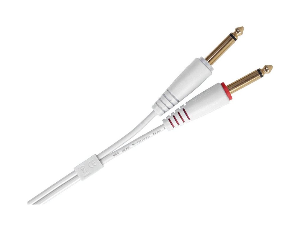 Podwójny kabel audio ze złączami TS 6,3 mm (duży jack) do podłączania DJ-ów, profesjonalnych i komercyjnych urządzeń, pozłacane styki złączy, wysokiej jakości ekranowanie, odporność mechaniczna, kolor biały.