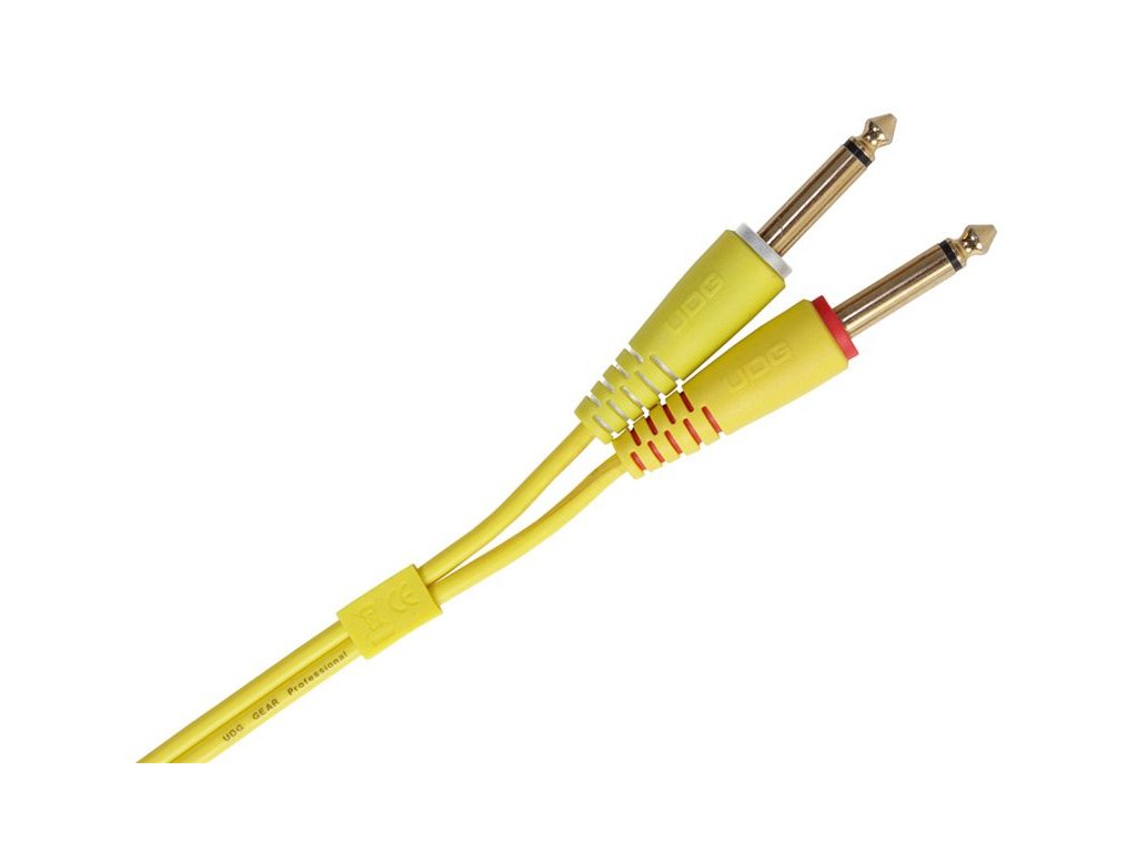 Podwójny kabel audio z wtykami TS 6,3 mm (duży jack) do podłączania DJ-ów, profesjonalnych i komercyjnych urządzeń, pozłacane styki wtyków, wysokiej jakości ekranowanie, odporność mechaniczna, kolor żółty.