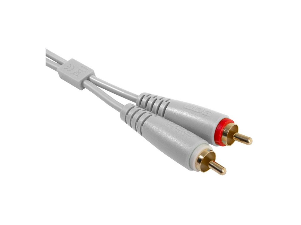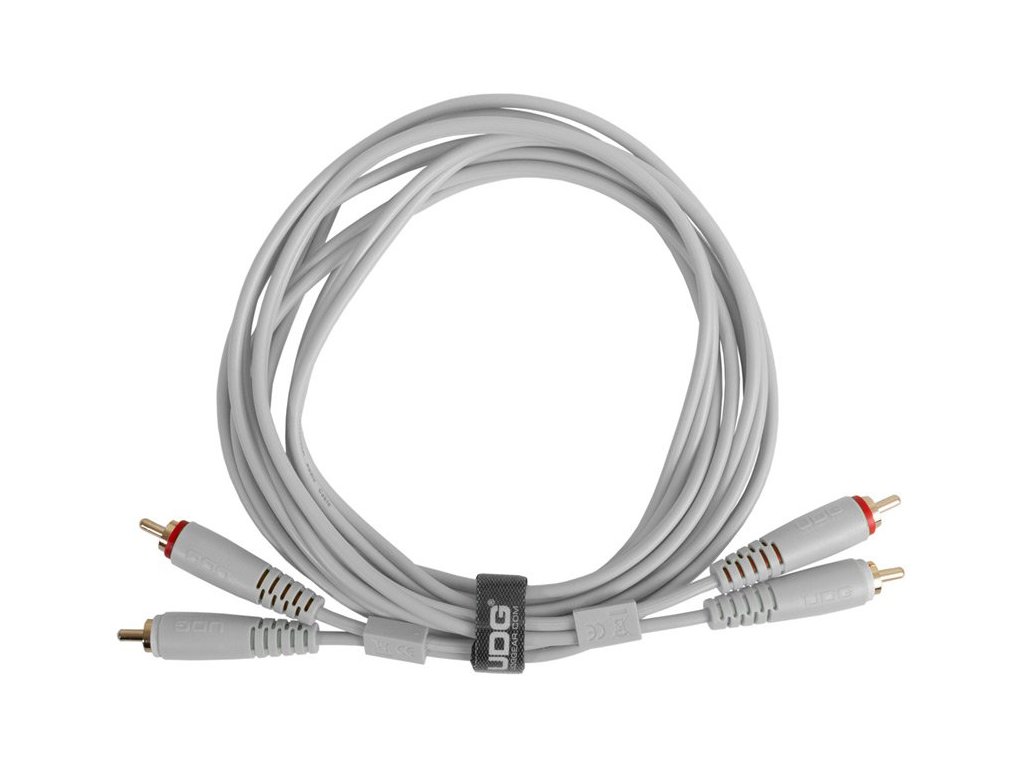 Podwójny kabel audio ze złączami RCA (cinch) do podłączania DJ-ów, profesjonalnych i komercyjnych urządzeń, pozłacane styki złączy, wysokiej jakości ekranowanie, odporność mechaniczna, kolor biały.