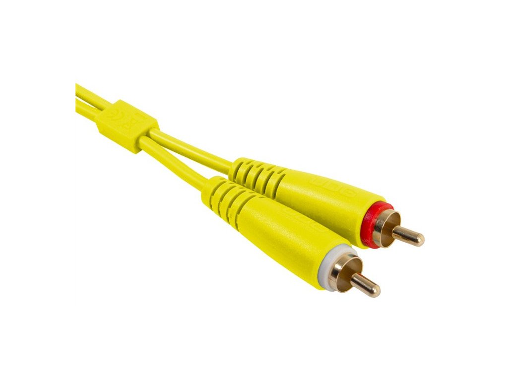 Podwójny kabel audio z wtykami RCA (cinch) do podłączania DJ-ów, profesjonalnych i komercyjnych urządzeń, pozłacane styki wtyków, wysokiej jakości ekranowanie, odporność mechaniczna, kolor żółty.