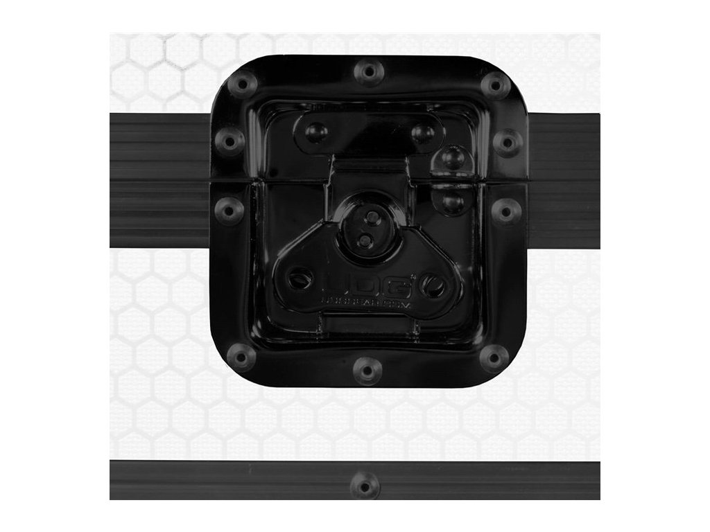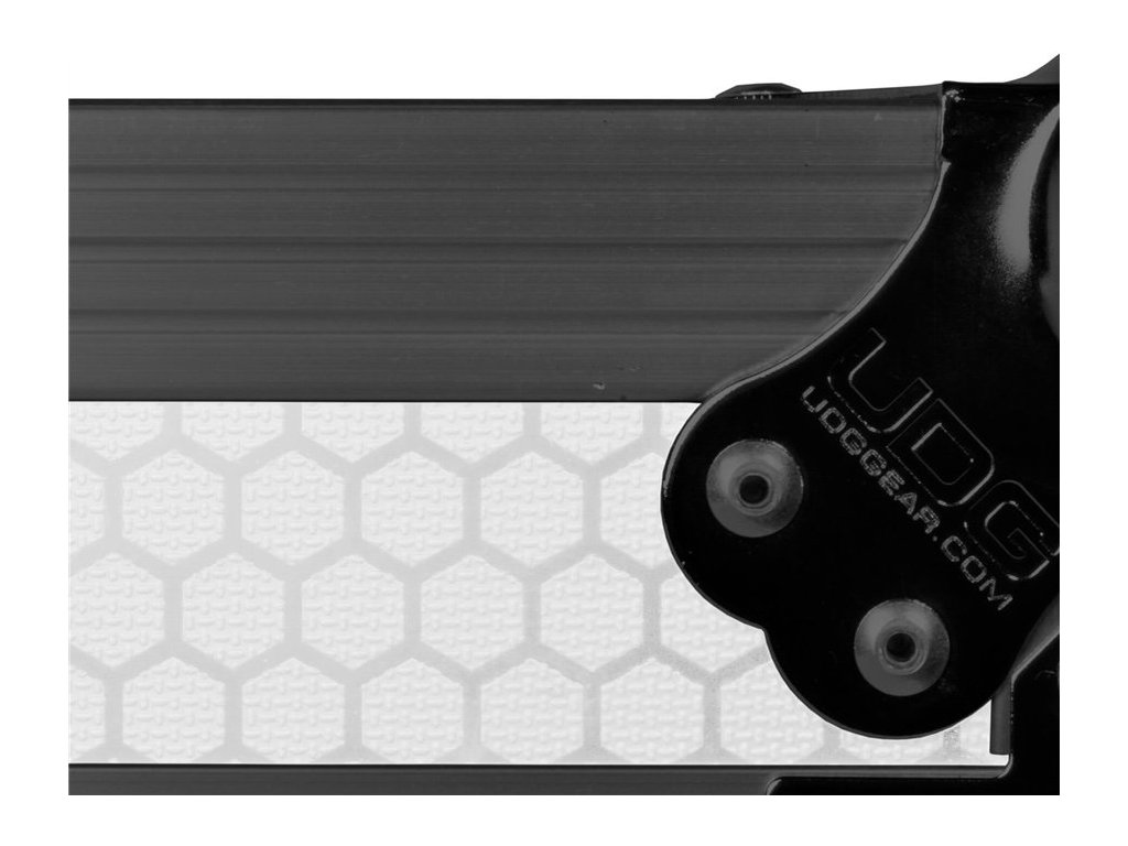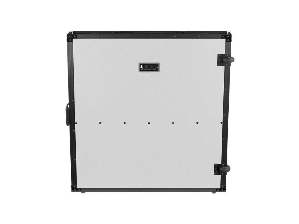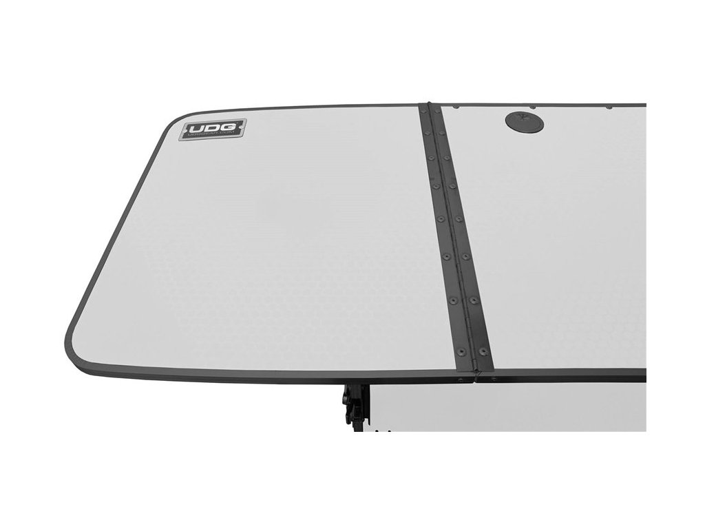 Składany stół dla DJ-ów UDG Ultimate to idealne rozwiązanie dla DJ-ów, którzy potrzebują w pełni modułowego systemu. Można go używać w domowym studio, do prywatnych produkcji lub na scenie. Stół jest wykonany z wytrzymałej sklejki o grubości 9 mm z białym laminatem i wzorem "Stage Grip" o strukturze plastra miodu (sześciokątnym). Zewnętrzne krawędzie są wyposażone w eleganckie, czarne, anodowane listwy aluminiowe. Dla lepszego prowadzenia i podłączania kabli stół jest wyposażony w przepust kablowy z osłoną. Standardowe wyposażenie obejmuje wbudowane, centralne kółka in-line z wysokiej jakości łożyskami po jednej stronie. Zamki motylkowe z blokadami bezpiecznie utrzymują stół w złożonym stanie. Profesjonalne uchwyty w miseczkach zapewniają wygodną obsługę.