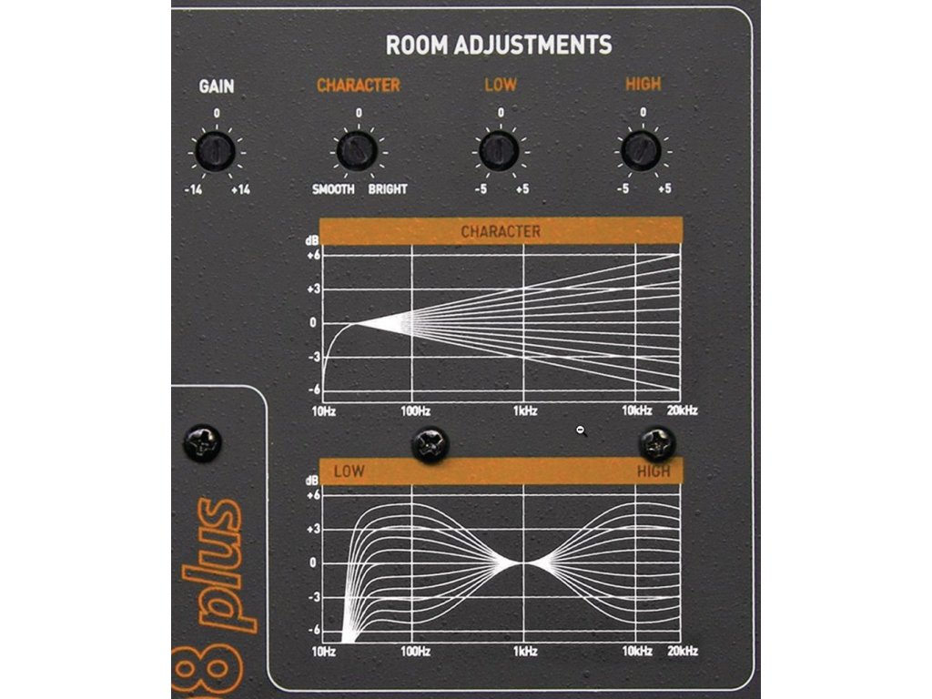 - Regulator korekcji pomieszczenia: Character: -6 .. 0dB .. +6; Low: -5 .. 0dB .. +5; High: -5 .. 0dB .. +5