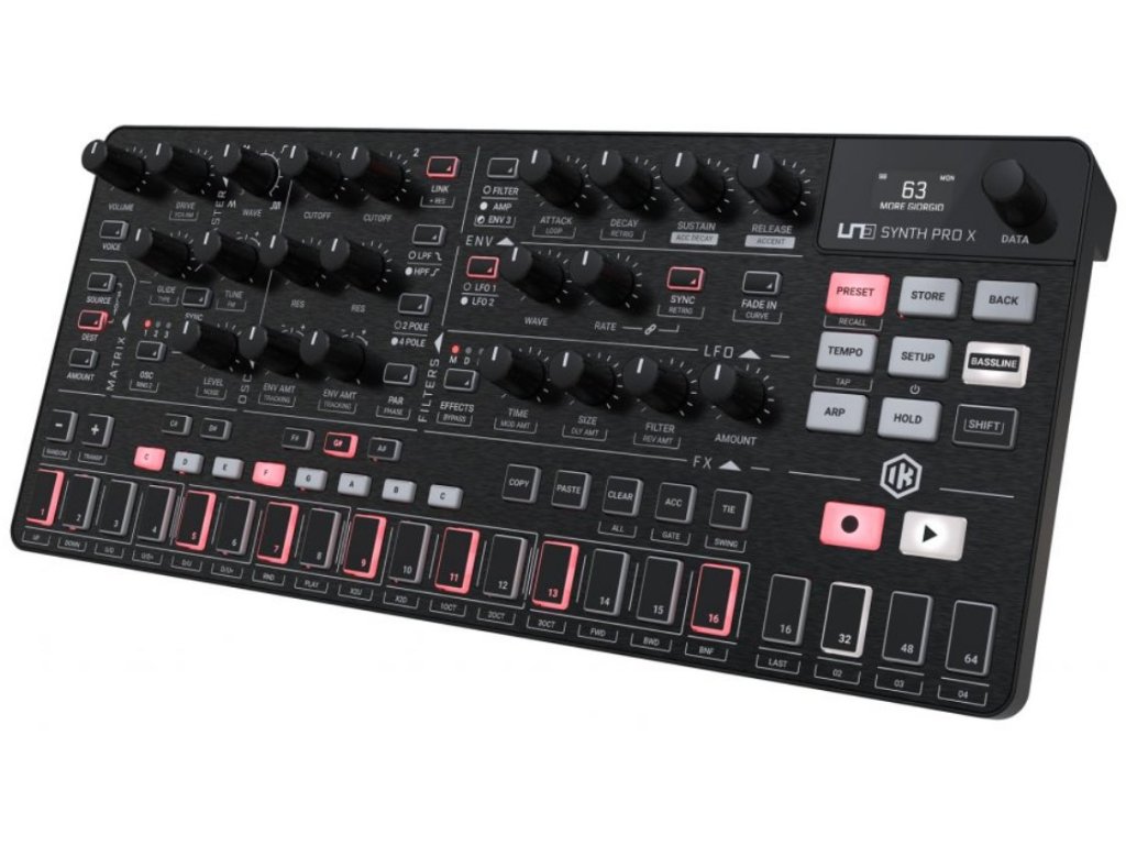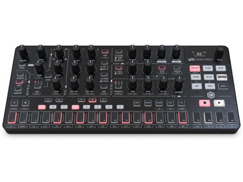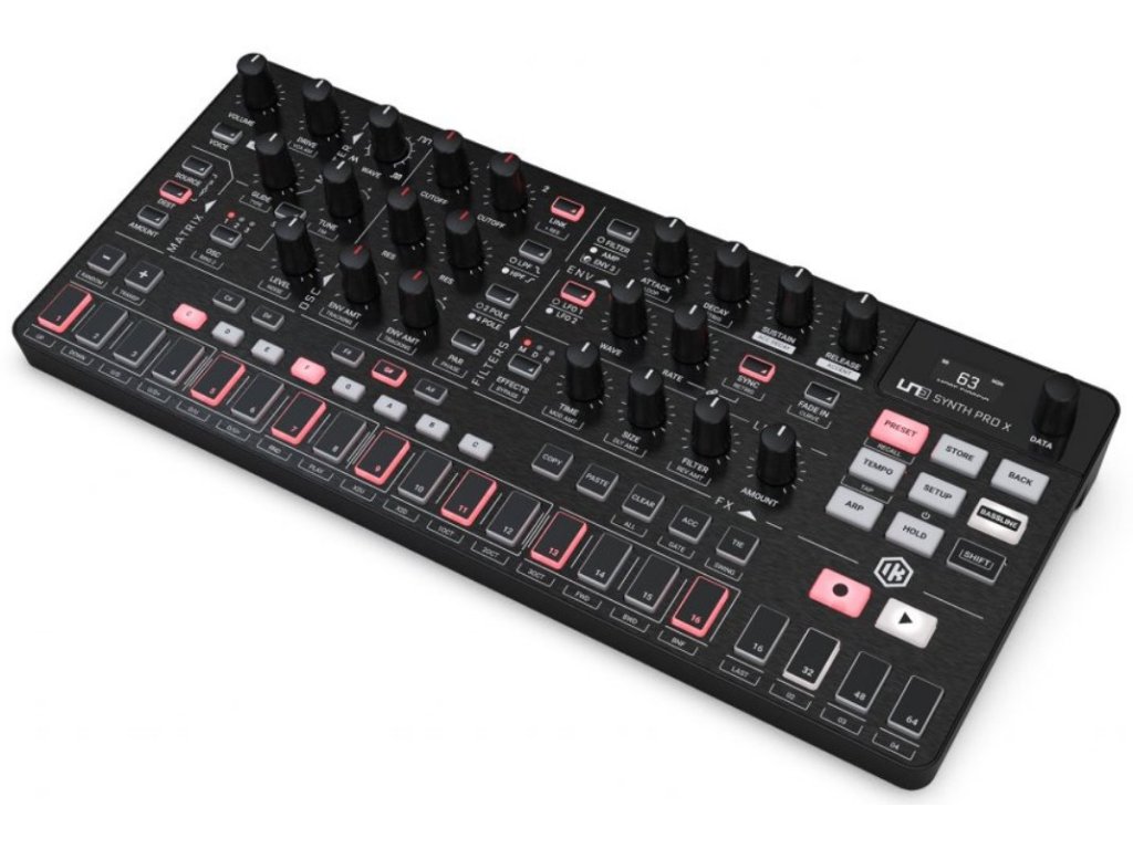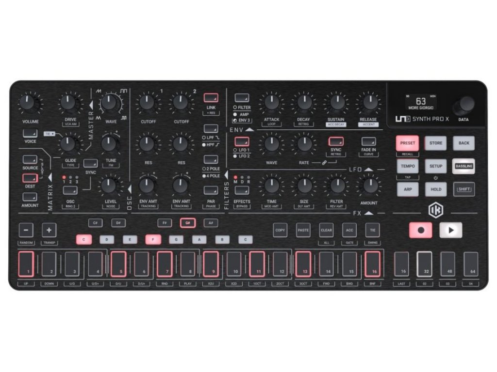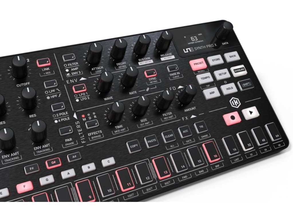 Za pomocą przycisków w dolnej części UNO Synth PRO X można zaprogramować sekwencer krokowy do 64 kroków. Każdy krok może zawierać, oprócz informacji o wysokości dźwięku, ustawienia do 48 parametrów dźwięku. W ten sposób można krok po kroku kreatywnie zmieniać barwę dźwięku lub wykorzystać sekwencer krokowy "tylko" do rytmizacji niektórych parametrów dźwięku (VCF, VCA, Efektów…), nie zmieniając wysokości dźwięku. Twoja kreatywność nie zna granic.