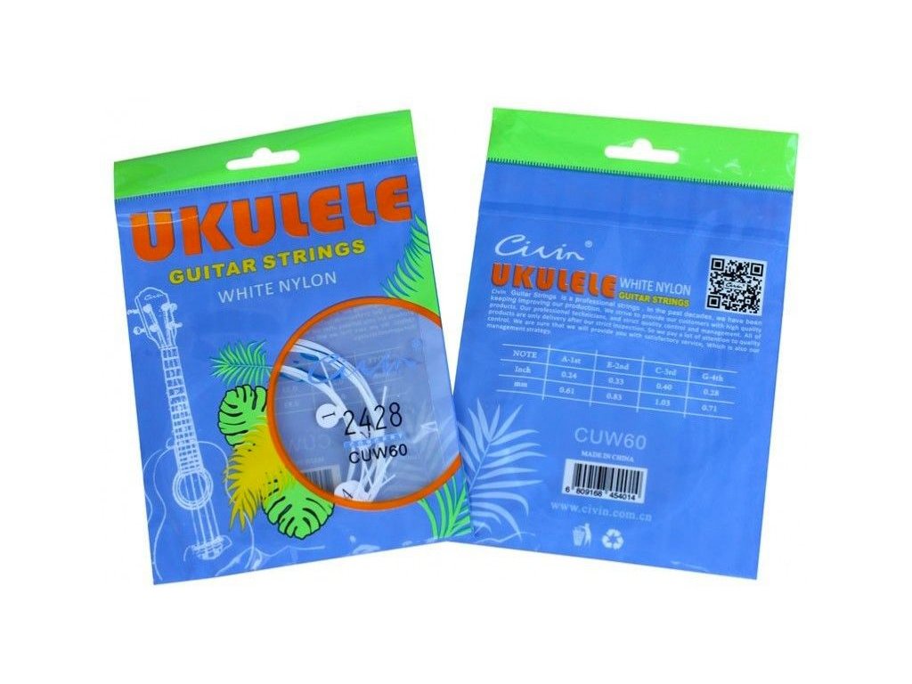 NN US 2428 to wysokiej jakości białe nylonowe struny do ukulele Civin. Struny wykonane są z syntetycznego polimeru o bardzo wysokiej wytrzymałości na rozciąganie. Charakteryzują się długą żywotnością oraz bardzo ładnym, klasycznym brzmieniem. To idealny zestaw strun do ukulele sopranowego, ukulele koncertowego i innych rodzajów tego instrumentu.