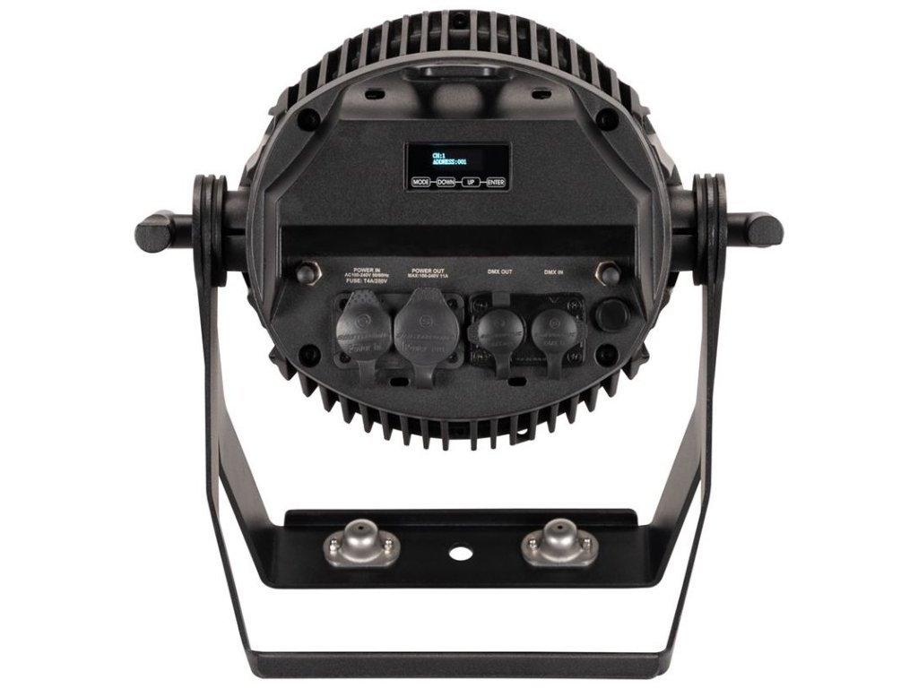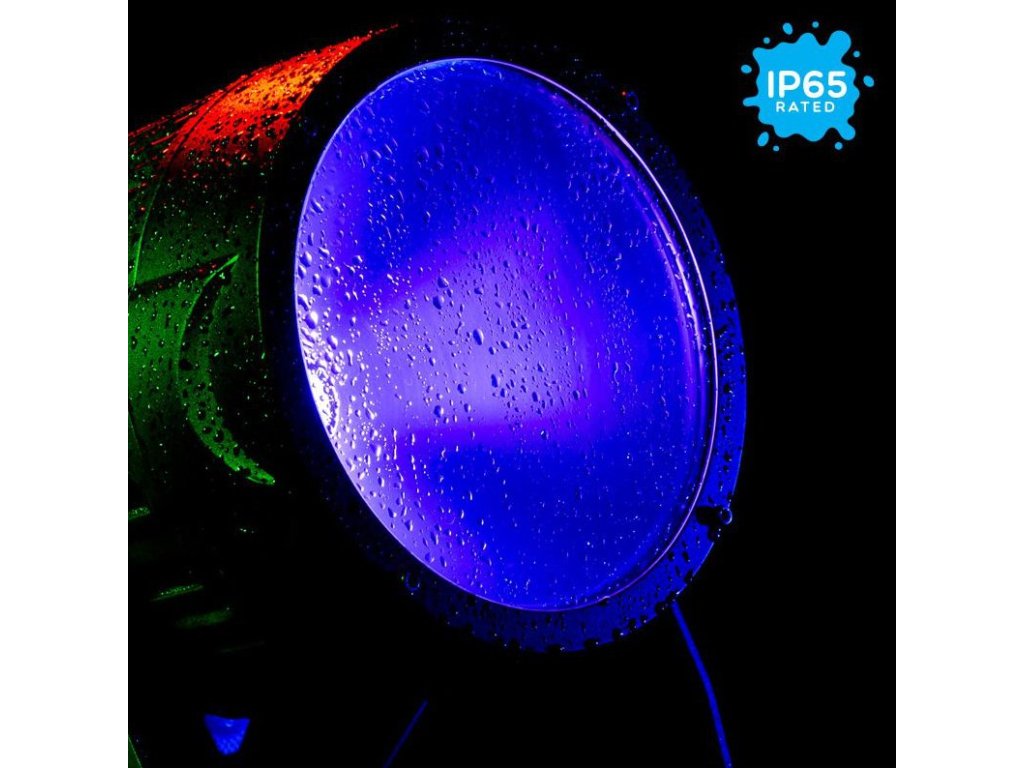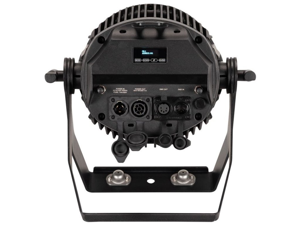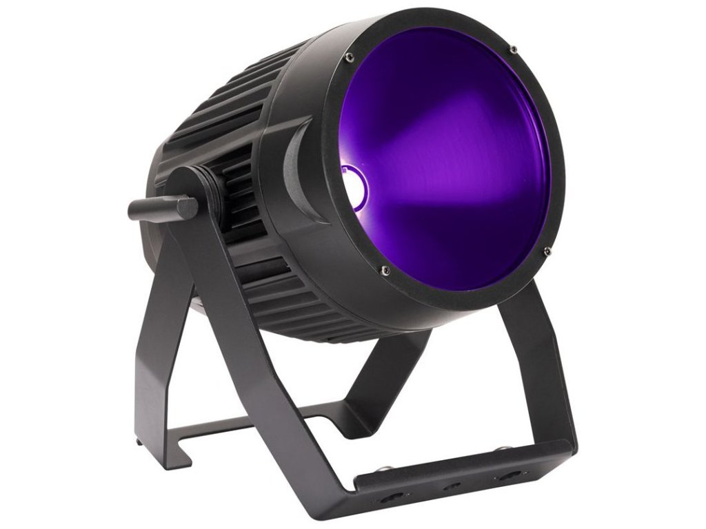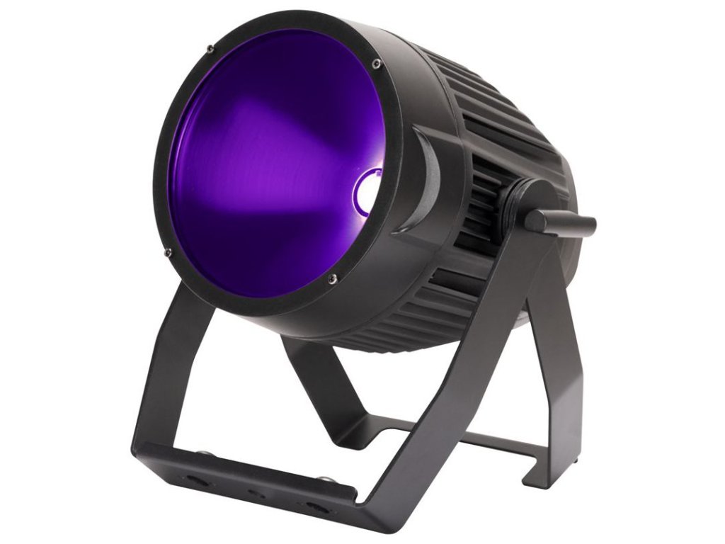 UV PAR 100IP jest wytrzymały i zaprojektowany do pracy w trudnych warunkach, wyposażony jest w wejścia DMX i wejścia z blokadą zasilania o stopniu ochrony IP65. Jego całkowicie metalowa obudowa zawiera jarzmo nożycowe z odbiornikami uchwytu Omega, co zapewnia elastyczne możliwości montażu. Dzięki certyfikatom CE, FCC i cETLus oprawa ta jest bezpieczna i niezawodna do profesjonalnego użytku.