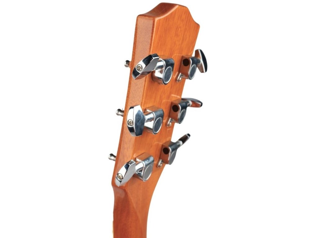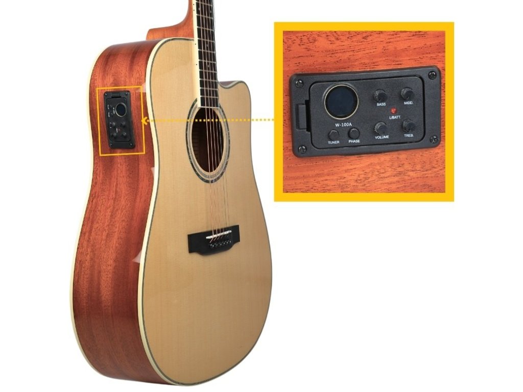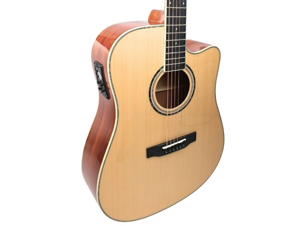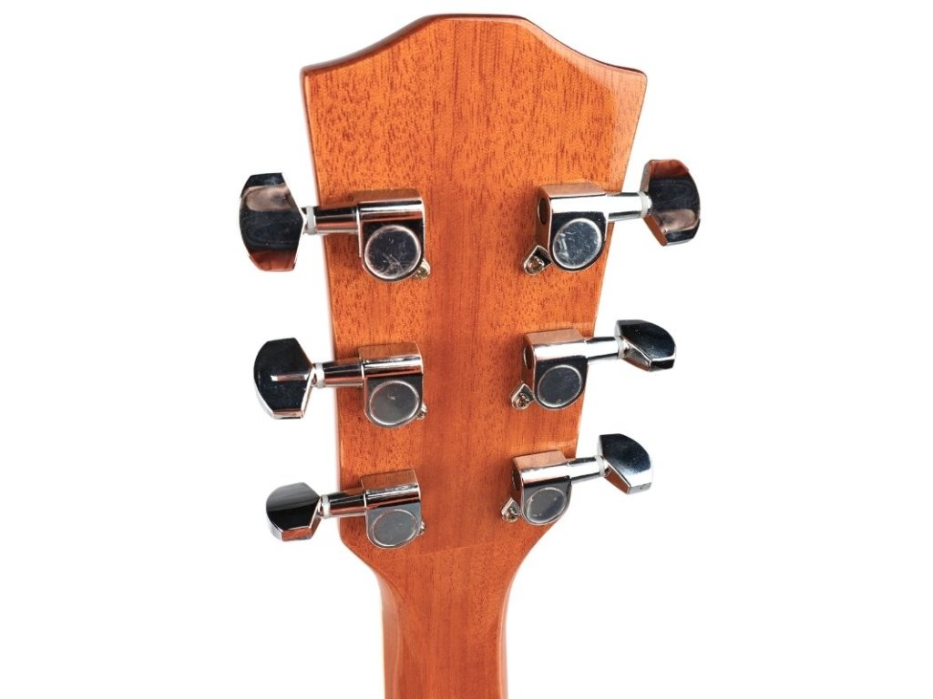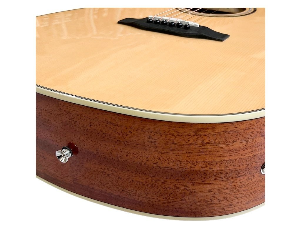 Dzięki zastosowaniu sklejki świerkowej na płytę wierzchnią oraz mahoniu na boki i tył, gitara jest niezwykle wytrzymała i pozwala osiągnąć ciepłe i bogate brzmienie. Naturalny kolor główki i jej mahoniowy fornir nadają gitarze profesjonalny wygląd, który przyciąga wzrok na scenie. Dwustronny pręt napinający regulowany obok otworu rezonansowego umożliwia precyzyjne dostrojenie naprężenia szyjki, co jest kluczowe dla komfortu gry i czystości dźwięku. Gitara jest wyposażona w 20 progów, co rozszerza możliwości muzyczne i pozwala na pełną ekspresję artystyczną. Materiały takie jak czarna podstrunnica HPL i binding z ABS w kolorze kości słoniowej zapewniają trwałość i estetyczny wygląd.
