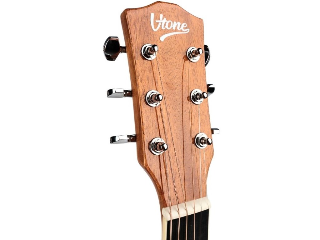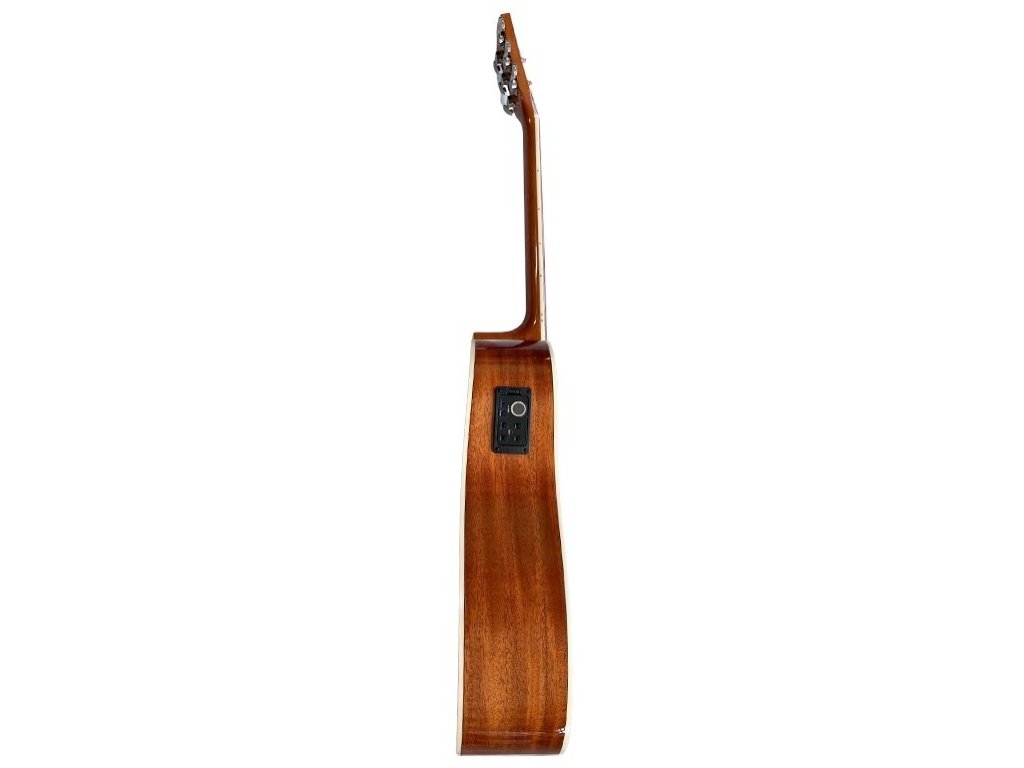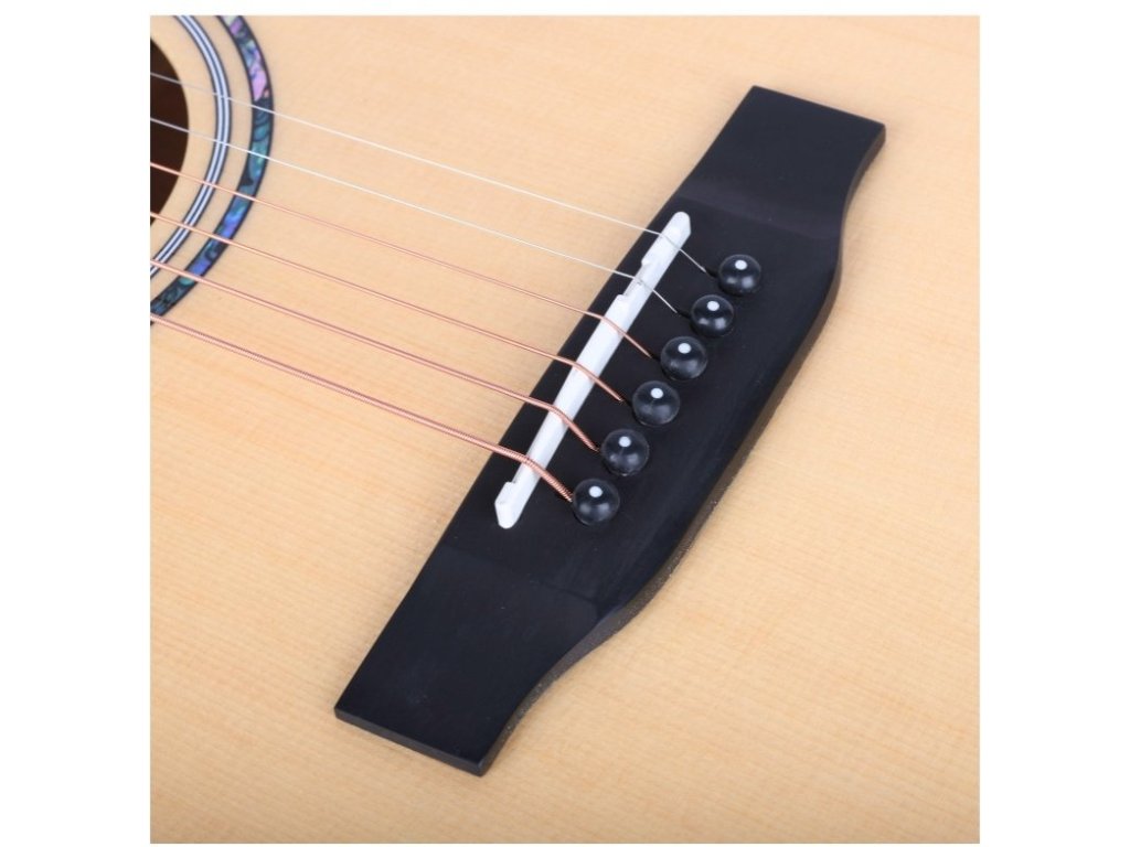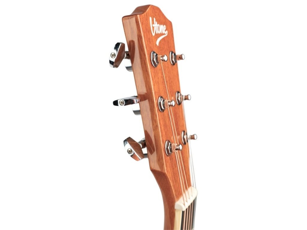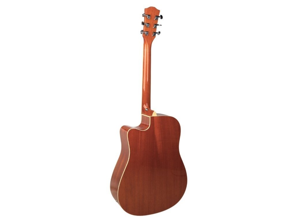 Dzięki zastosowaniu sklejki świerkowej na płytę wierzchnią oraz mahoniu na boki i tył, gitara jest niezwykle wytrzymała i pozwala osiągnąć ciepłe i bogate brzmienie. Naturalny kolor główki i jej mahoniowy fornir nadają gitarze profesjonalny wygląd, który przyciąga wzrok na scenie. Dwustronny pręt napinający regulowany obok otworu rezonansowego umożliwia precyzyjne dostrojenie naprężenia szyjki, co jest kluczowe dla komfortu gry i czystości dźwięku. Gitara jest wyposażona w 20 progów, co rozszerza możliwości muzyczne i pozwala na pełną ekspresję artystyczną. Materiały takie jak czarna podstrunnica HPL i binding z ABS w kolorze kości słoniowej zapewniają trwałość i estetyczny wygląd.