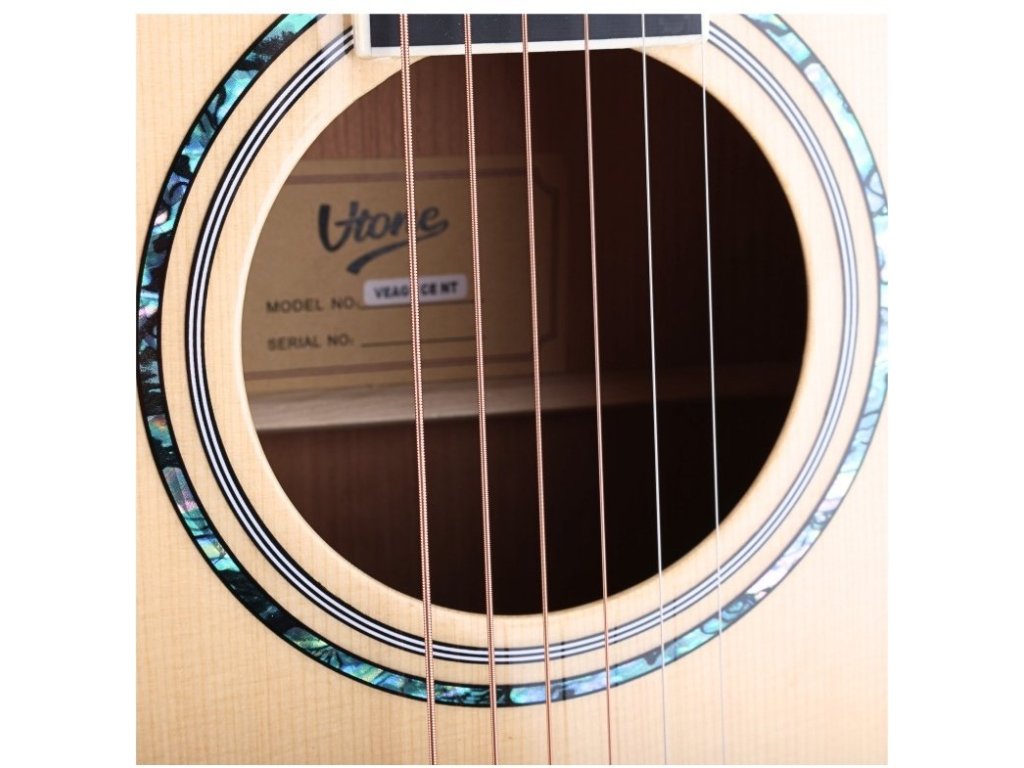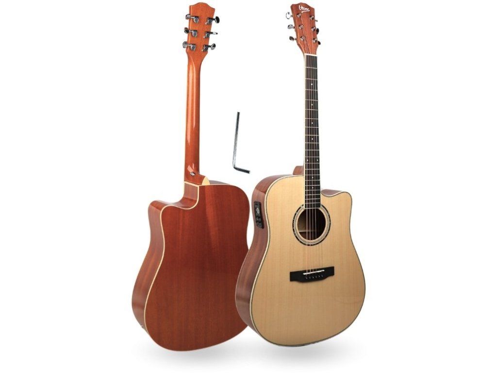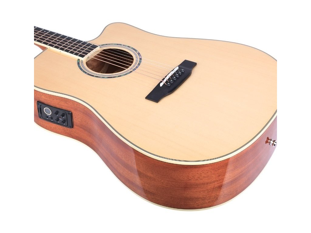 V-TONE VEAG1 CE NT to wysokiej jakości gitara elektroakustyczna o pełnym rozmiarze, która jest doskonałym wyborem zarówno dla początkujących, jak i zaawansowanych muzyków. Naturalne, błyszczące wykończenie dodaje instrumentowi elegancji, czyniąc z niego nie tylko instrument muzyczny, ale również stylowy dodatek. Dzięki swojej długości i kształcie dreadnought z wycięciem, gitara zapewnia łatwy dostęp do wyższych progów do grania skomplikowanych akordów i solówek, dodatkowo gwarantuje pełne, głębokie brzmienie, które zadowoli nawet najbardziej wymagające ucho.