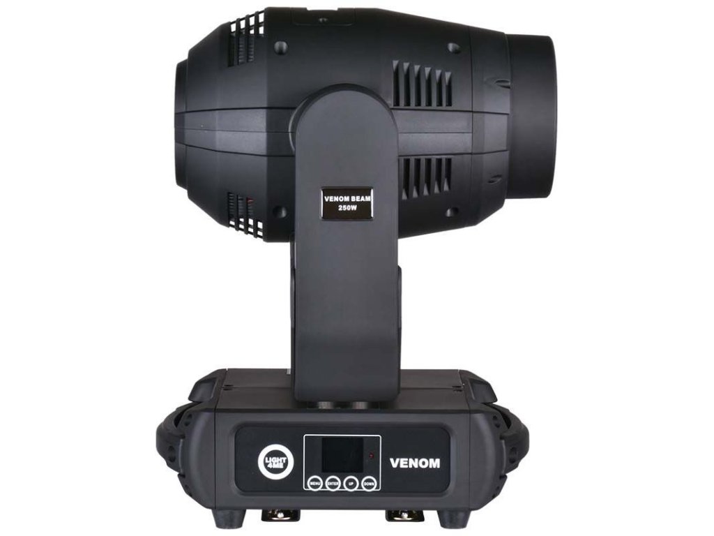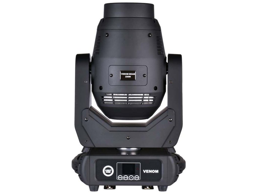 Podstawa obrotowej głowy Venom Beam 250W V2 LED jest wyposażona w wygodne uchwyty do przenoszenia i uchwyty umożliwiające zawieszenie techniki na rampach oświetleniowych i konstrukcjach kratownicowych. Z tyłu znajdują się złącza zasilania PowerCon (IN/OUT), które umożliwiają podłączenie zasilania bezpośrednio z urządzenia do urządzenia i zmniejszają potrzebę stosowania długiego i nieporęcznego okablowania. Jest to bardzo przydatne w sytuacjach, gdy efekty świetlne są instalowane w dużej liczbie i w trudno dostępnych miejscach, na przykład wysoko nad sceną. Venom Beam 250 jest również wyposażony w 3-pinowe i 5-pinowe złącza DMX. Z przodu znajduje się czytelny wyświetlacz LCD i 4 przyciski, które umożliwiają poruszanie się po menu i zmianę parametrów pracy.