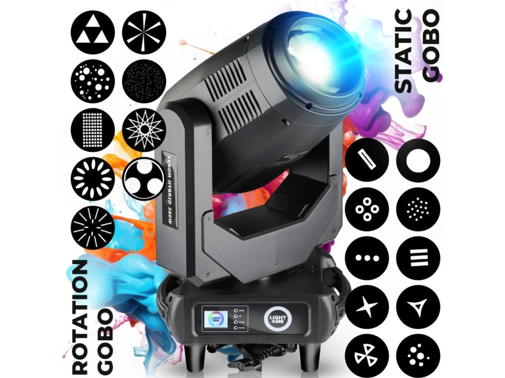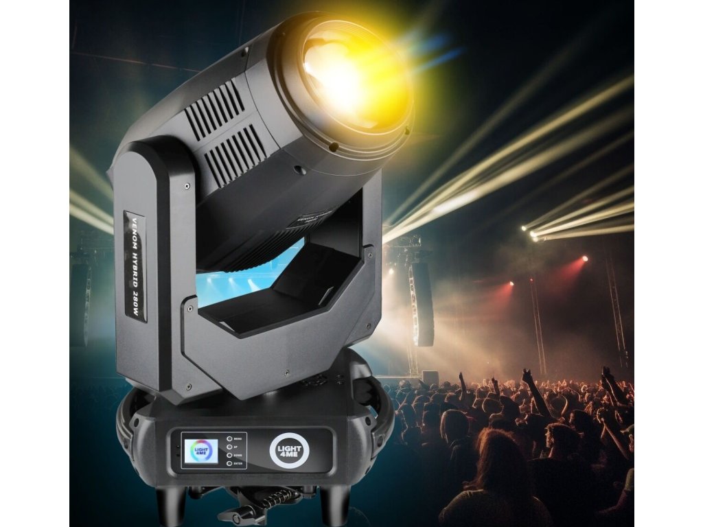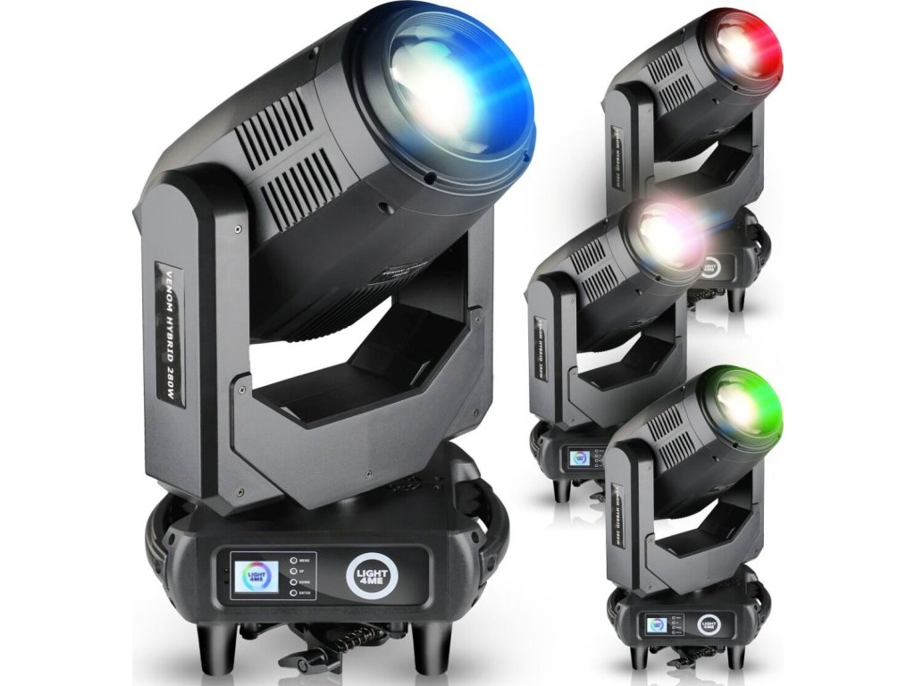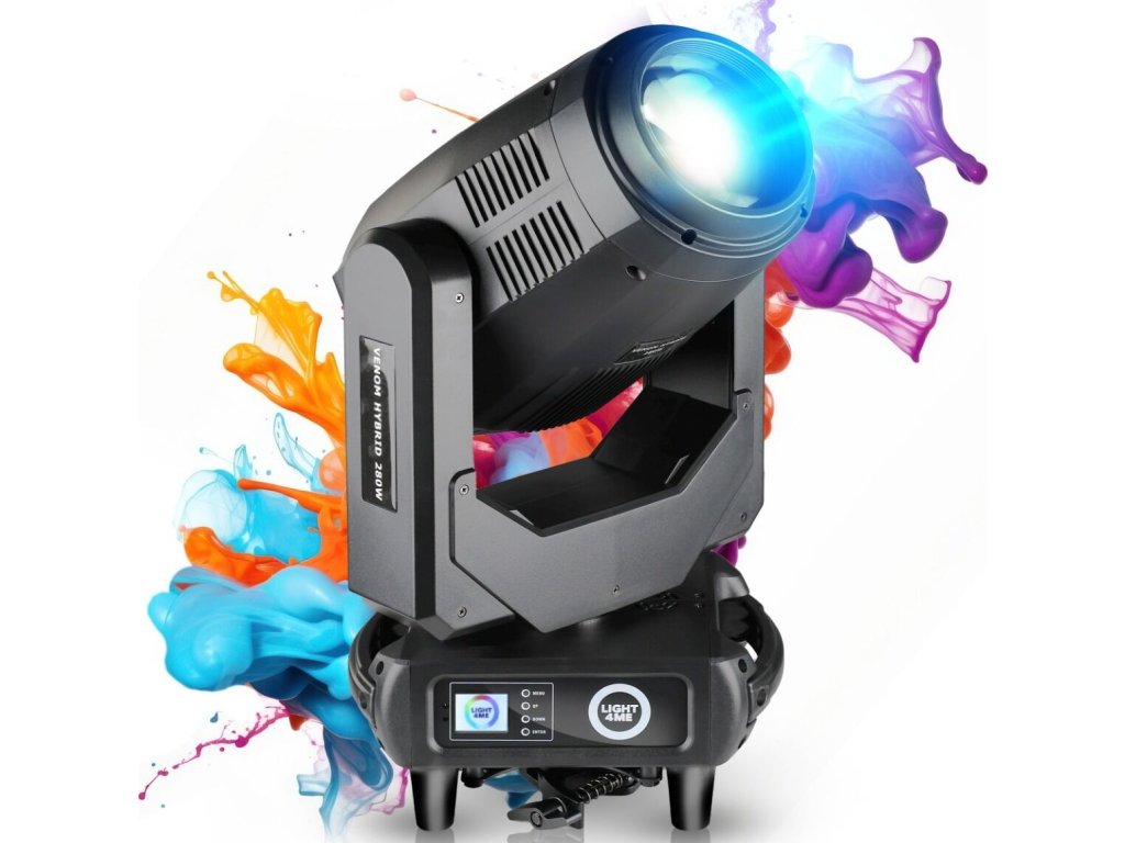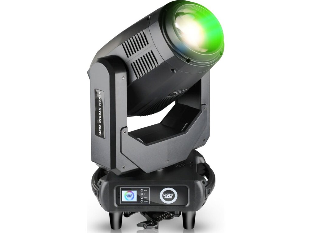 Light4Me Venom Hybrid 280W to zaawansowana hybrydowa głowica obrotowa typu beam spot wash, przeznaczona na sceny koncertowe, do klubów muzycznych, na imprezy plenerowe, do teatrów oraz wypożyczalni sprzętu oświetleniowego. Oferuje precyzyjną kontrolę światła, bardzo szeroki zakres efektów i płynność ruchu, co przekłada się na całkowitą swobodę w kreacji wizualnej. Jest to rozwiązanie doceniane przez realizatorów oświetlenia, DJ-ów, techników scenicznych oraz organizatorów wydarzeń, którzy oczekują niezawodności i elastyczności w jednym urządzeniu.
