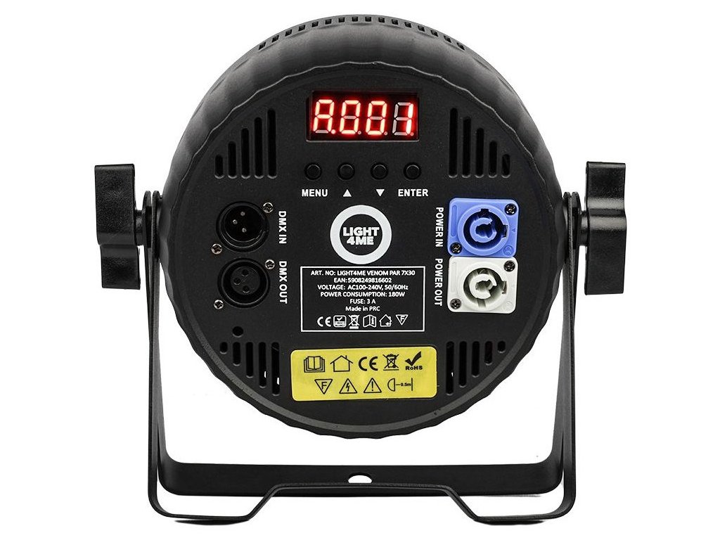 Komponenty Light4me Venom Par 7x30 zamknięte są w solidnej aluminiowej obudowie o nowoczesnym designie, która jest odporna na uszkodzenia i wysokie temperatury. Po bokach obudowy przymocowany jest uchwyt montażowy, który daje reflektorowi LED możliwość pracy samodzielnie stojąc lub być zawieszonym na rampach oświetleniowych i konstrukcjach kratownicowych. W tylnej części znajdują się złącza typu PowerCon z funkcją "pass on" umożliwiającą połączenie zasilania wielu jednostek oraz 3-pin XLR IN/OUT umożliwiające przesyłanie sygnałów DMX. Nad złączami znajduje się panel sterowania w postaci cyfrowego wyświetlacza LCD i czterech przycisków. Za ich pomocą możemy wybrać jeden z kilku trybów pracy reflektora: