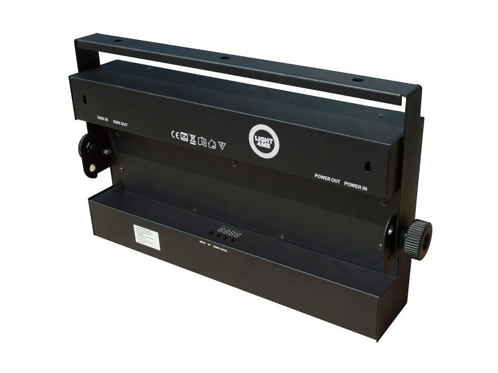 Po prawej i lewej stronie korpusu reflektora przymocowany jest solidny uchwyt montażowy, który umożliwia jego instalację na kratownicach i rampach oświetleniowych. W tylnej części znajduje się gniazdo zasilania, wejście i wyjście dla sygnałów DMX oraz panel sterowania w postaci cyfrowego wyświetlacza LED i czterech przycisków (Menu, Up, Down, Enter). Za jego pomocą możemy ręcznie ustawić statyczny kolor światła klapy lub wybrać jeden z czterech trybów pracy: