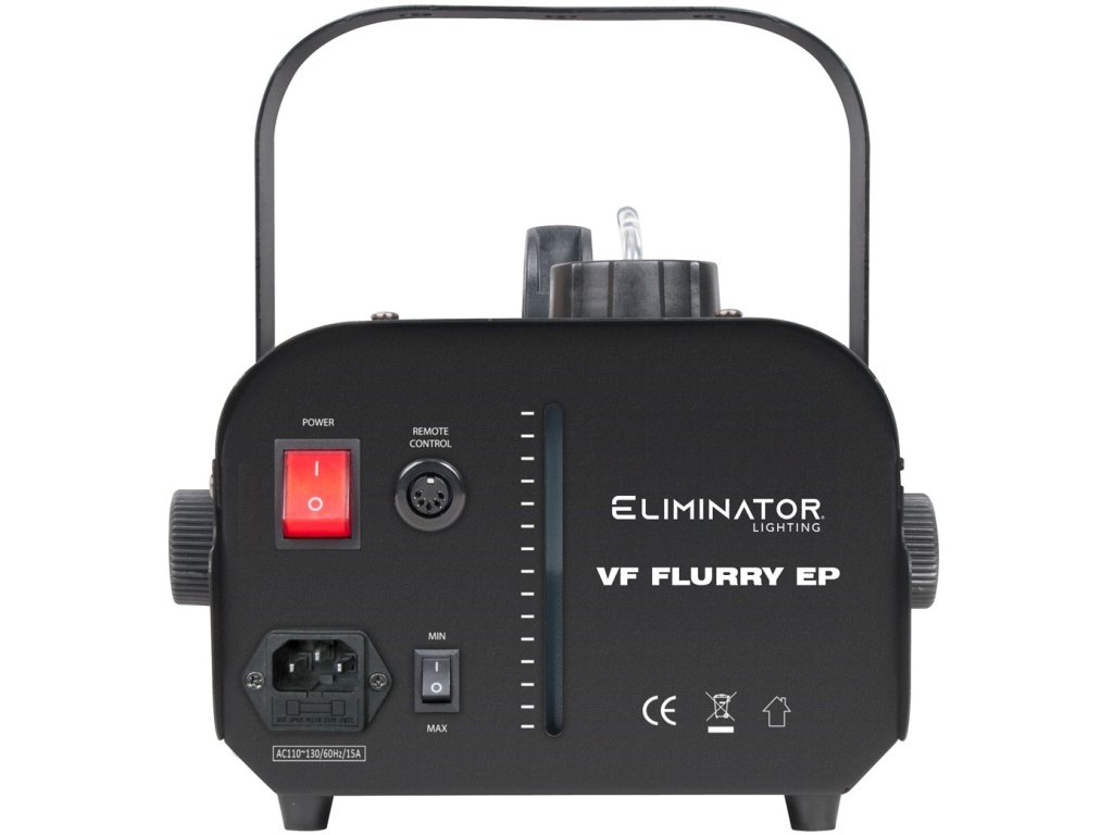 Eliminator Lighting VF Flurry EP to wydajna maszyna do śniegu o mocy 600 W, zaprojektowana do efektywnego pokrywania śniegiem na odległość 2-5 metrów. Jego funkcje obejmują wybór niskiej lub wysokiej objętości, automatyczne wyłączanie przy niskim poziomie płynu do śniegu w celu ochrony pompy, wskaźnik poziomu płynu do śniegu i wewnętrzny zbiornik na 1 litr płynu do śniegu. Urządzenie jest wyposażone również w wyłącznik na tylnym panelu i wykorzystuje płyn do śniegu na bazie wody.