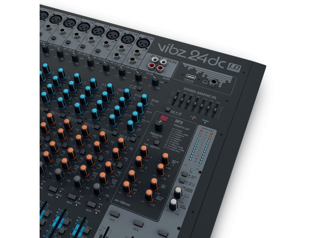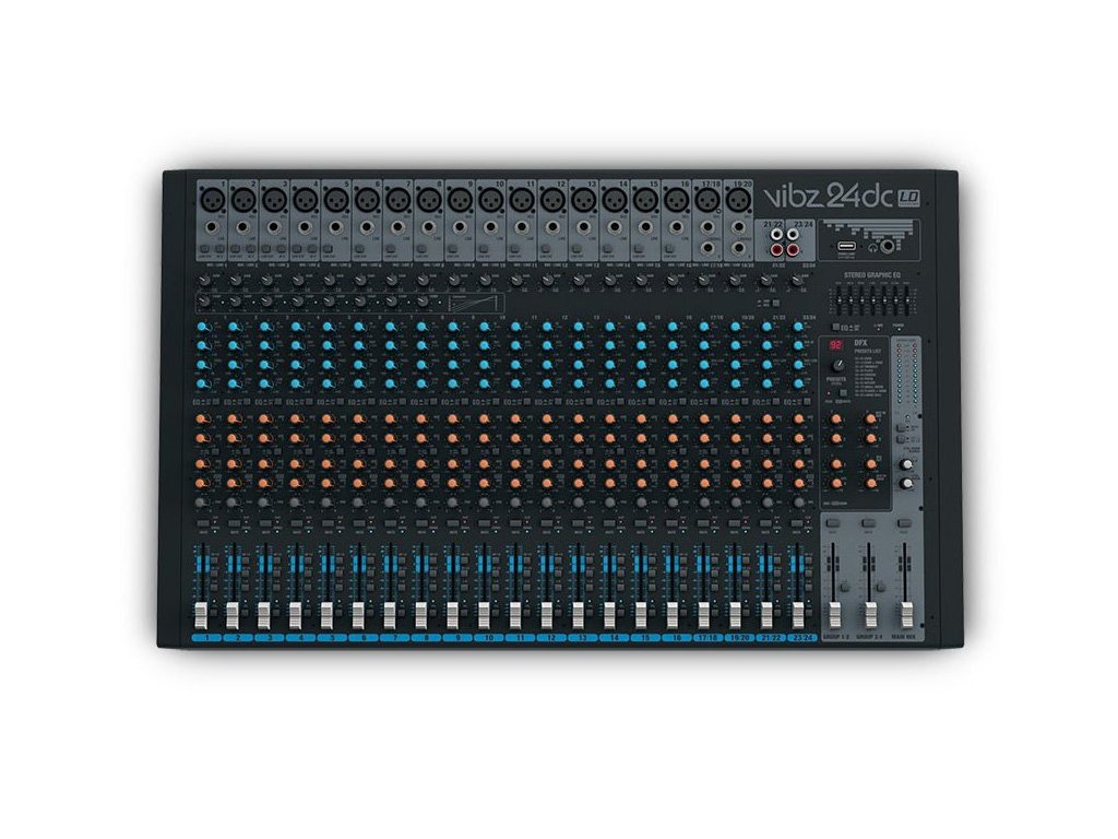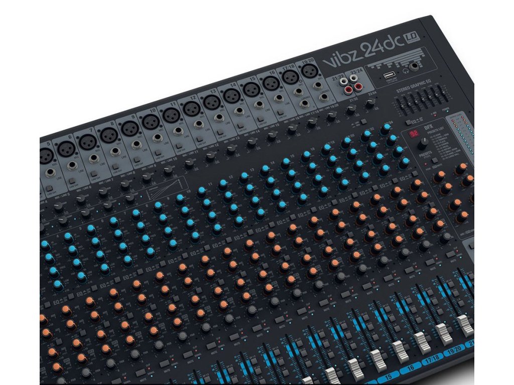 Seria konsolet mikserskich VIBZ niemieckiej firmy LD Systems oferuje wszystko, od kompaktowych urządzeń odpowiednich na kameralne imprezy, po w pełni profesjonalne rozwiązania. Wybrane modele posiadają cyfrowy moduł efektów oraz wbudowany kompresor. Wszystkie konsolety posiadają symetryczne wejścia XLR/TRS, wejście RCA do odtwarzania podkładów i innych zewnętrznych źródeł, equalizer oraz pętlę efektów. To wszystko przy zakresie częstotliwości 10 Hz – 45 kHz. VIBZ 24 DC oferuje 18 wejść mikrofonowych z wysokiej jakości przedwzmacniaczami, monofoniczne kompatybilne stereofoniczne wejścia liniowe, kompresor z płynną regulacją na pierwszych ośmiu kanałach, osiem wejść insertowych, cztery podgrupy i 24 cyfrowe efekty. Dzięki temu jest to bardzo elastyczny mikser odpowiedni do nagłośnienia na żywo i nagrywania. Dźwięk można pokolorować za pomocą 4-pasmowej korekcji z półparametrycznym środkiem, a także filtra low-cut do obcinania niepożądanych niskich częstotliwości. Sekcja Master oferuje profesjonalne symetryczne wyjścia XLR, główne i grupowe wyjścia z miernikami, wyjście dla odsłuchów i słuchawek z regulacją głośności oraz globalny 7-pasmowy equalizer.