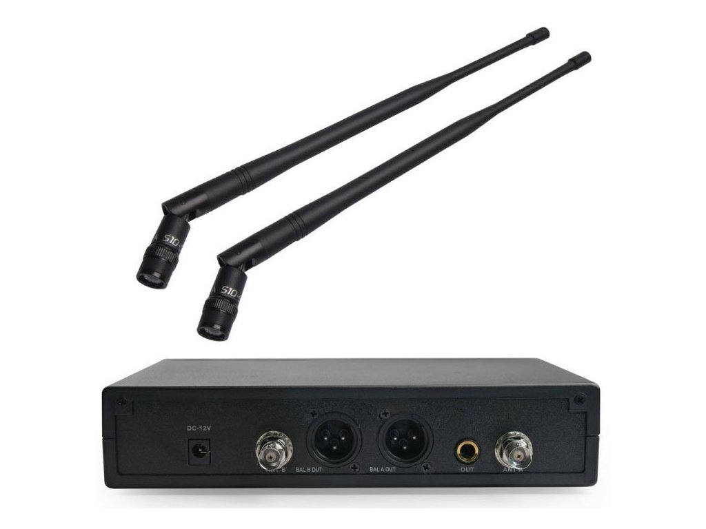 Drugą częścią systemu jest odbiornik o zakresie częstotliwości od 518 do 542 MHz. Z tyłu obudowy znajdują się wyjścia XLR dla kanałów A i B, gniazdo jack (1/4 "), gniazdo zasilacza oraz dwa złącza antenowe BNC. Z przodu znajduje się wyłącznik, dwa potencjometry, odbiornik podczerwieni oraz podwójny panel sterowania z wyświetlaczem LCD. Wyświetla aktualne parametry systemu, takie jak poziom sygnału RF / AF, ustawienie częstotliwości odbiornika, wybrany kanał roboczy oraz informację, czy mikrofony są aktualnie włączone, czy wyłączone. Za pomocą przycisków Góra, Dół i Ustaw można ręcznie wybrać częstotliwość lub przeprowadzić automatyczne skanowanie, podczas którego nieprzerwana częstotliwość zostanie automatycznie przypisana do urządzeń systemowych.