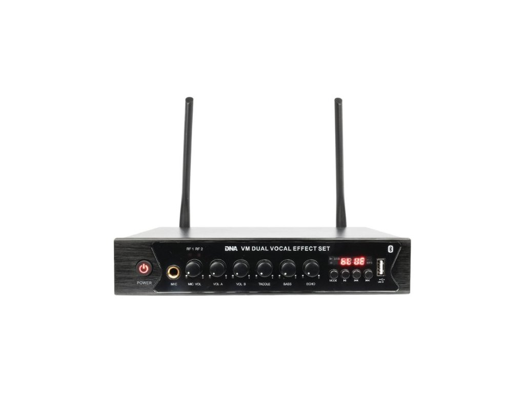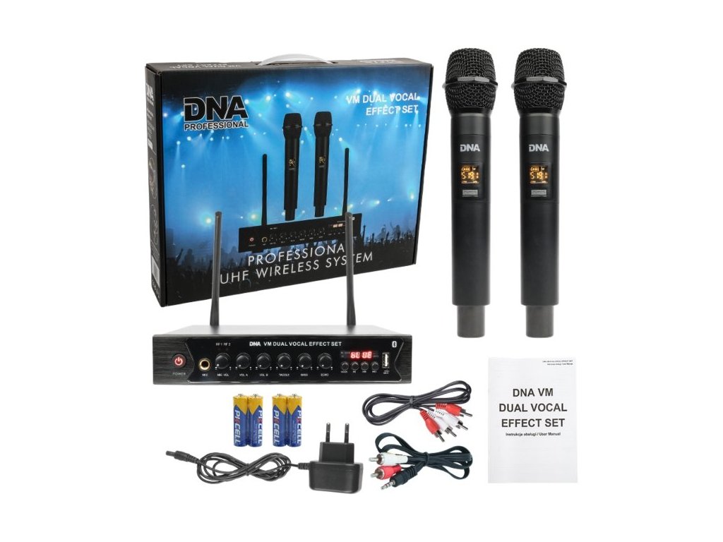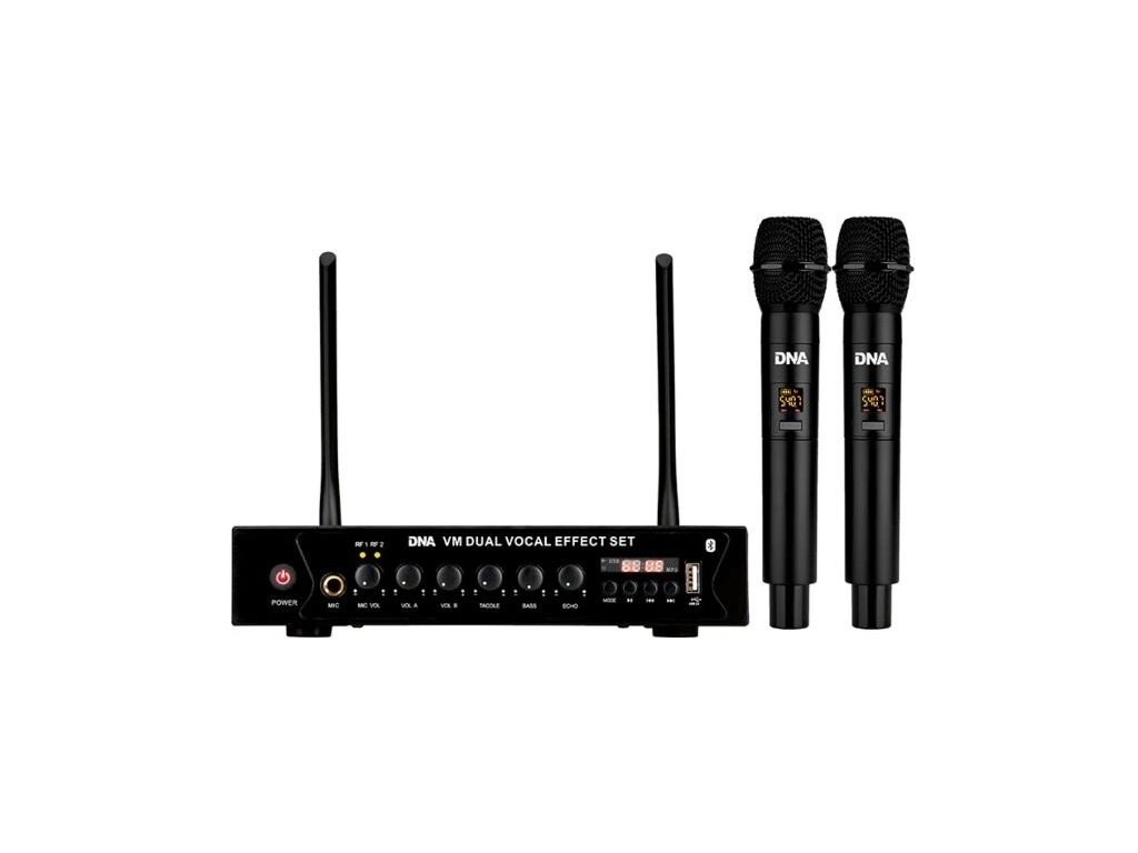 DNA VM Dual Vocal Effect Set to wysokiej jakości bezprzewodowy system mikrofonowy oparty na technologii cyfrowej. Zestaw składa się z 2 mikrofonów bezprzewodowych i małego, kompaktowego odbiornika FM z portem USB i wbudowanym odtwarzaczem MP3, regulowanym efektem "echo" oraz obsługą Bluetooth. Idealnie nadaje się jako system nagłośnieniowy dla zespołów weselnych, animatorów, firm organizujących imprezy, karaoke, a także dla różnego rodzaju instytucji kulturalnych i edukacyjnych.