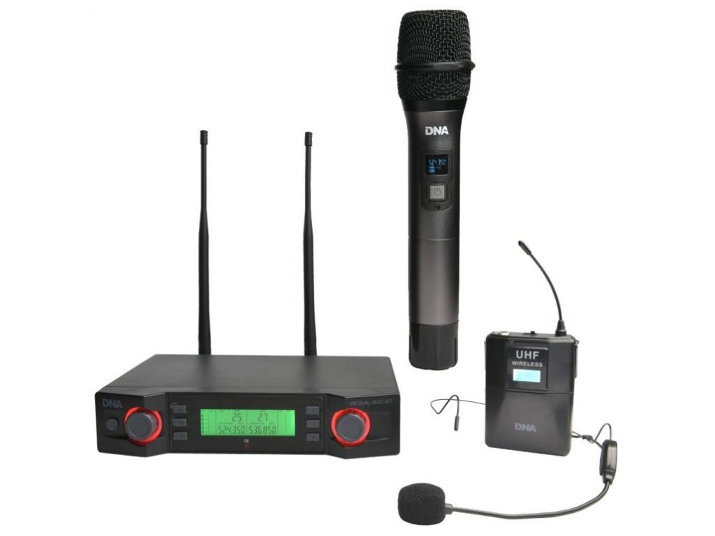 DNA VM - DUAL VOCAL HEAD SET to wysokiej jakości bezprzewodowy system mikrofonowy oparty na technologii cyfrowej. Zestaw składa się z odbiornika (UHF), bezprzewodowego mikrofonu i nadajnika (tzw. "Bodypacku") wyposażonego w mikrofon nagłowny. Zestaw idealnie nadaje się na małe koncerty i występy na żywo, podczas imprez, na weselach, ale także w pracy lektorów i mobilnych DJ-ów.