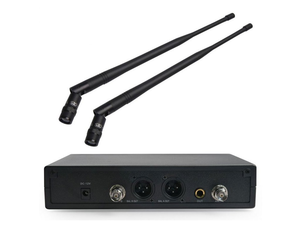 Drugą częścią systemu jest odbiornik o zakresie częstotliwości od 518 do 542 MHz. Z tyłu obudowy znajdują się wyjścia XLR dla kanałów A i B, gniazdo jack (1/4 "), gniazdo zasilacza oraz dwa złącza antenowe BNC. Z przodu znajduje się wyłącznik, dwa potencjometry, odbiornik podczerwieni oraz podwójny panel sterowania z wyświetlaczem LCD. Wyświetla aktualne parametry systemu, takie jak poziom sygnału RF / AF, ustawienie częstotliwości odbiornika, wybrany kanał roboczy oraz informację, czy mikrofony są aktualnie włączone, czy wyłączone. Za pomocą przycisków Góra, Dół i Ustaw można ręcznie wybrać częstotliwość lub przeprowadzić automatyczne skanowanie, podczas którego nieprzerwana częstotliwość zostanie automatycznie przypisana do urządzeń systemowych.