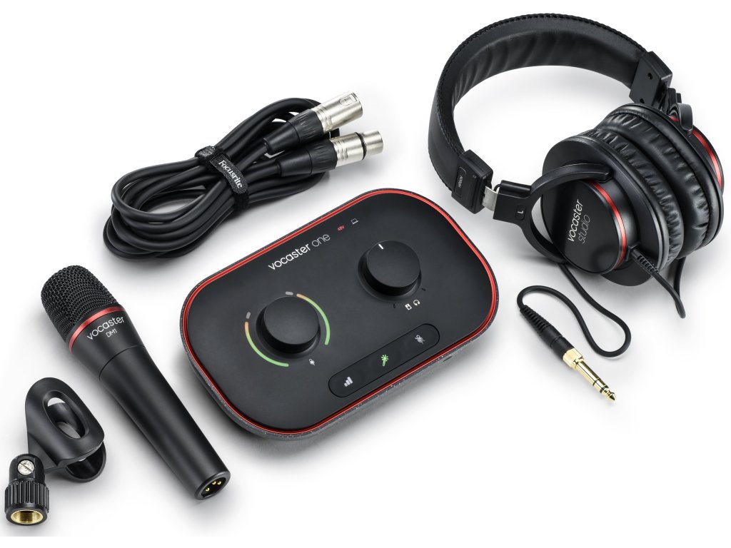 - Zawartość opakowania: Vocaster One, słuchawki HP60v, mikrofon dynamiczny DM1, uchwyt mikrofonowy, kabel XLR, kabel USB