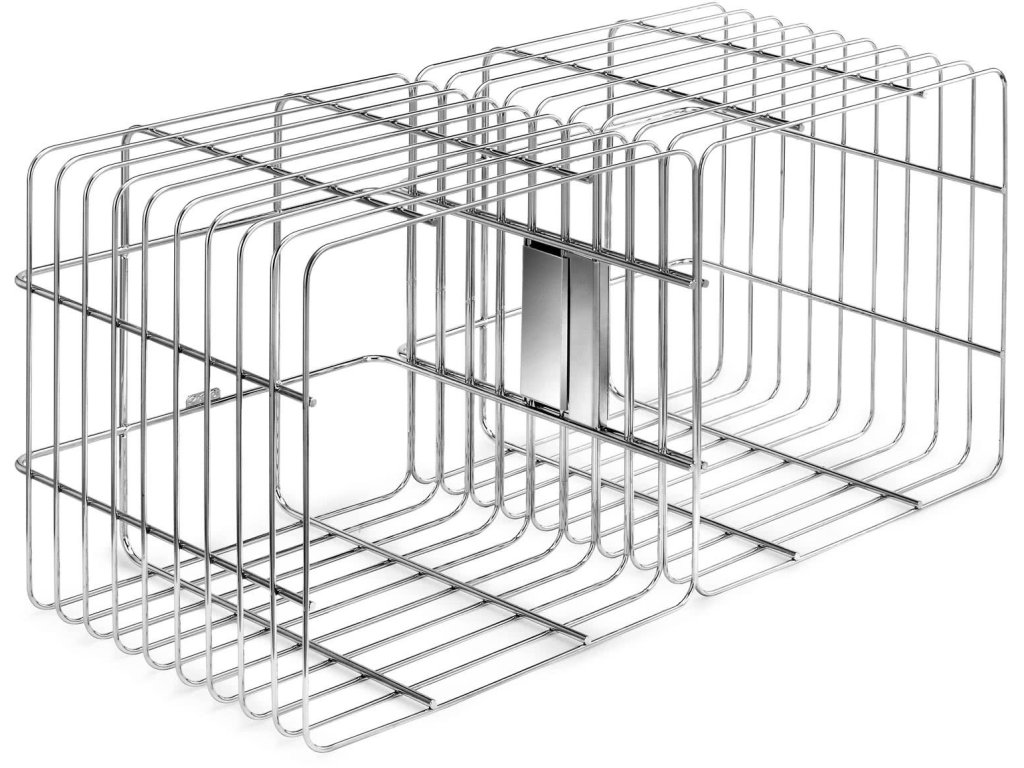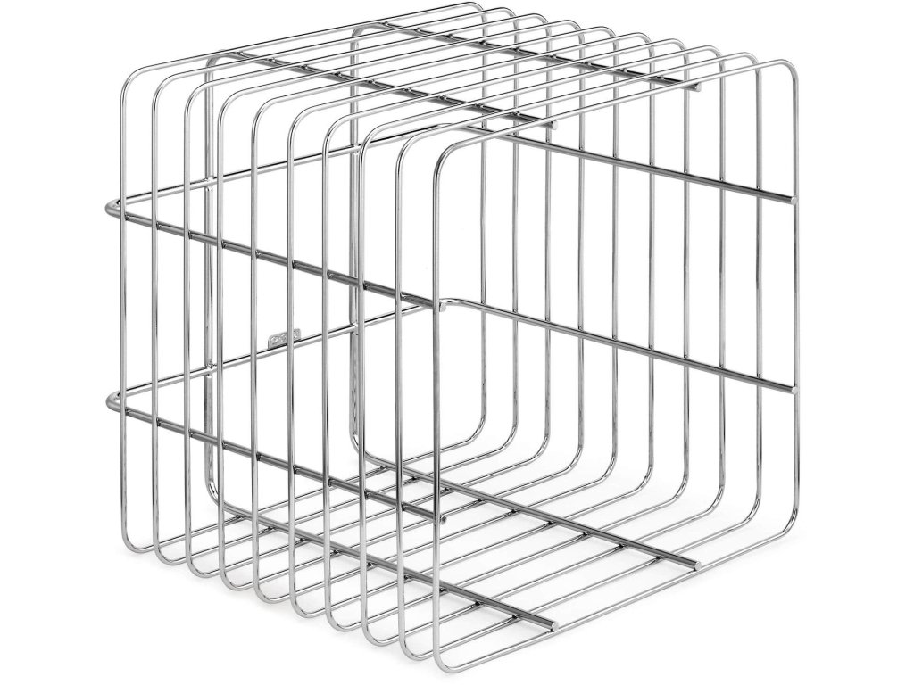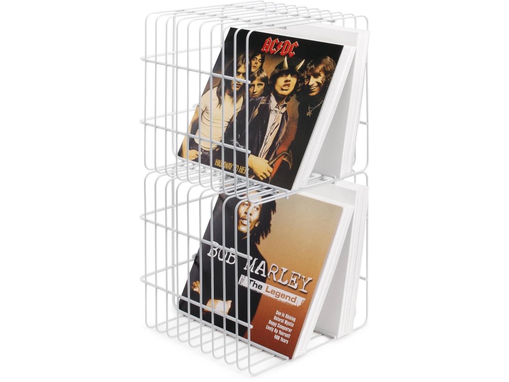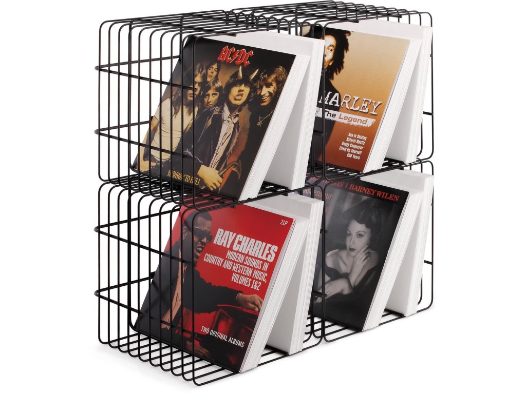 Metalowy pojemnik do przechowywania płyt winylowych.