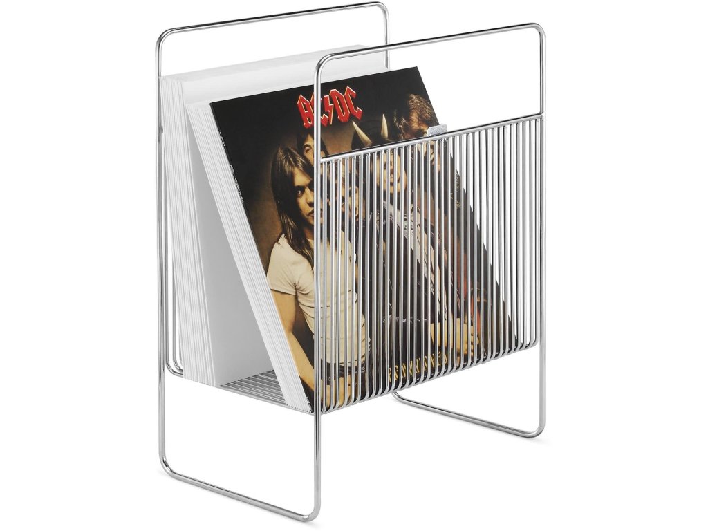 Metalowy pojemnik do przechowywania płyt winylowych.