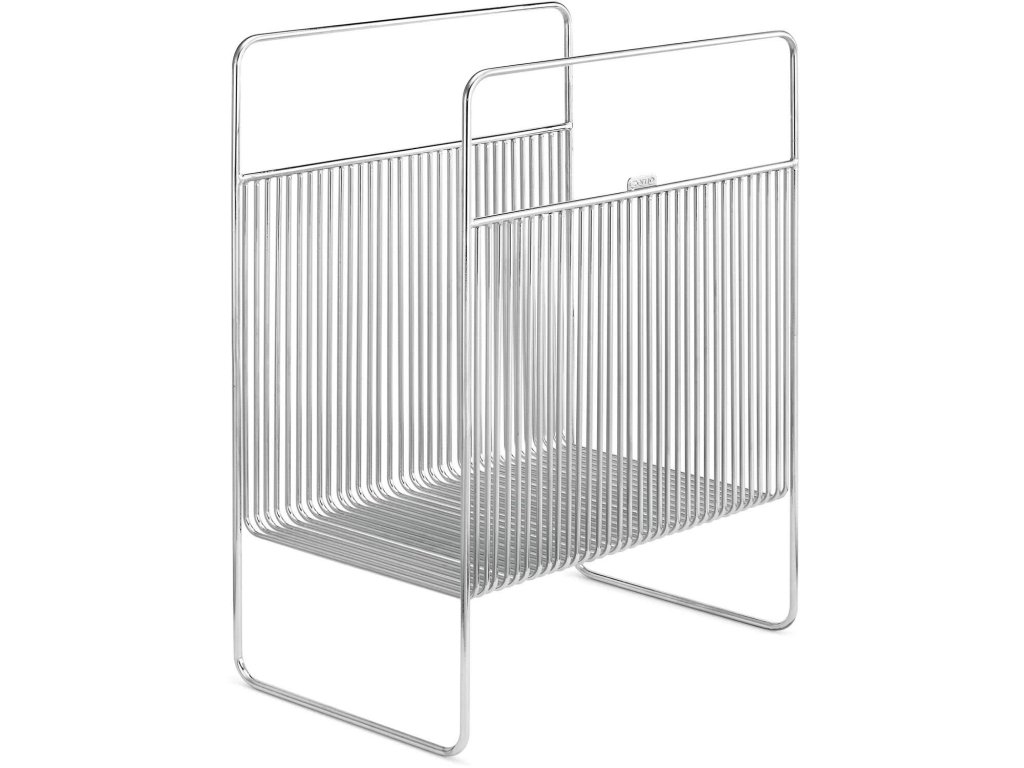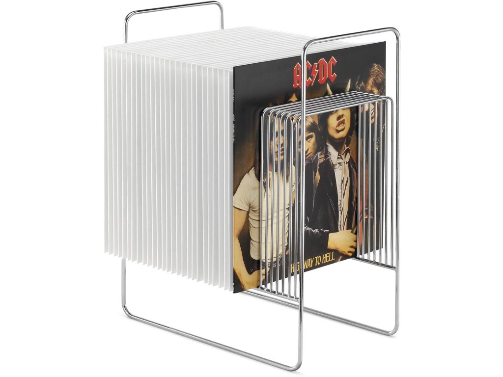 Metalowy pojemnik do przechowywania płyt winylowych.