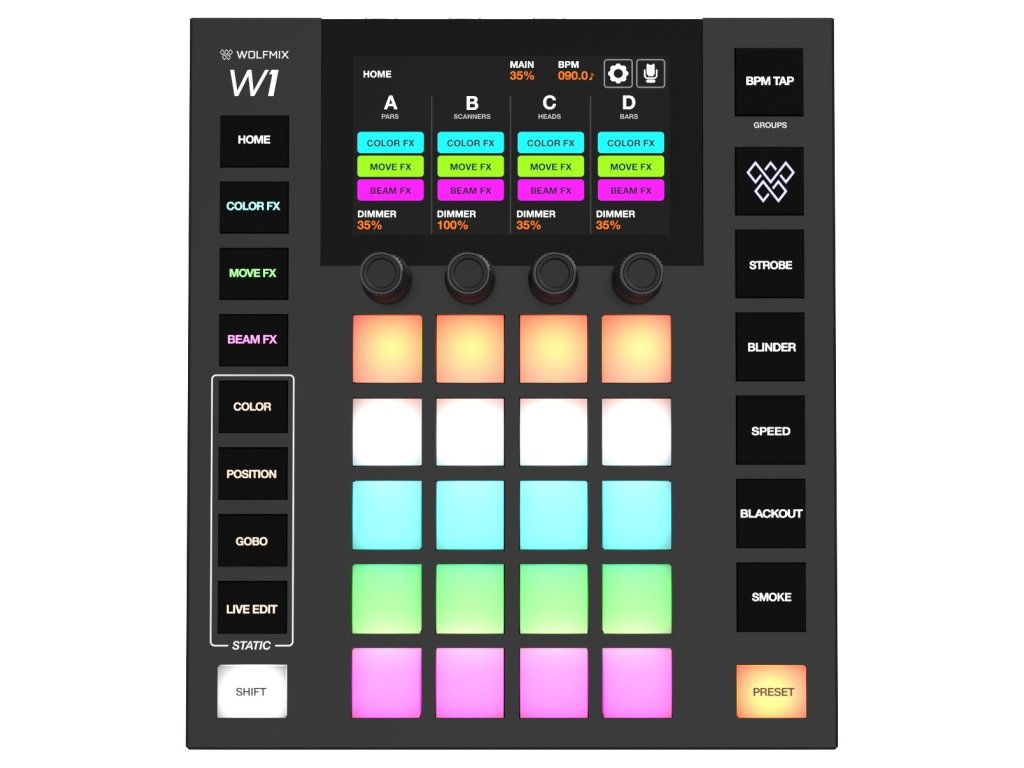 Wolfmix W1 MK2 jest wyposażony w kolorowy wyświetlacz TFT o przekątnej 4,3 cala z przyciemnianym szkłem, który zapewnia wyraźny i przejrzysty interfejs do sterowania systemem oświetleniowym. Wyświetlacz jest dotykowy, co umożliwia łatwą nawigację po menu i ustawieniach. Niezależnie od tego, czy wybierasz różne urządzenia oświetleniowe, czy dostosowujesz parametry pokazu świetlnego, wyświetlacz Wolfmix W1 zapewnia wizualne informacje zwrotne potrzebne do precyzyjnej regulacji. Dzięki intuicyjnemu interfejsowi możesz łatwo tworzyć fascynujące efekty świetlne.