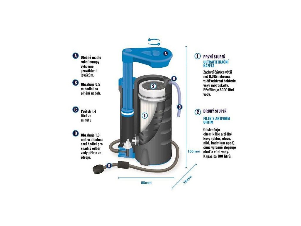 - Zawiera wąż ssący o długości 1,3 m do pobierania wody bezpośrednio ze źródła i wąż wyjściowy o długości 0,5 m do napełniania naczyń