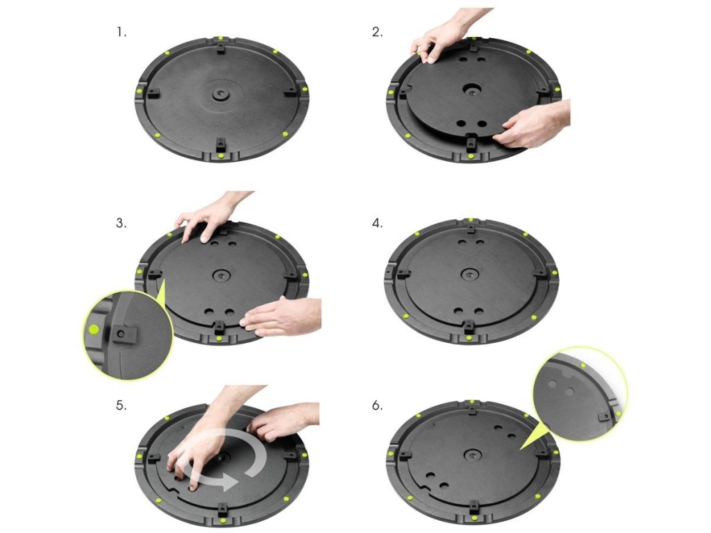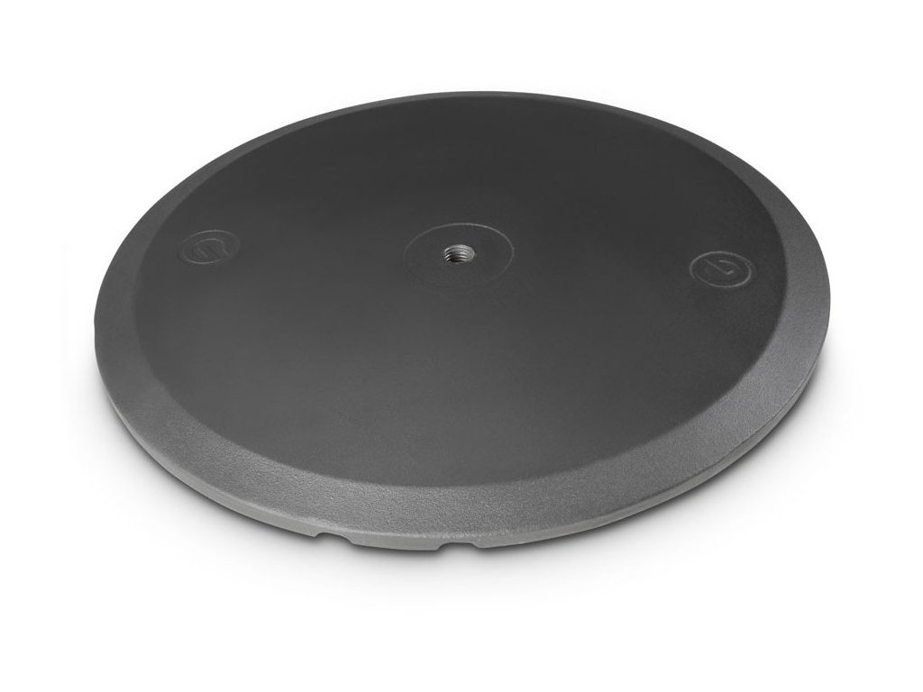 Ta płaska, ciężka, okrągła podstawa z żeliwa nadaje się do tyczek z gwintem M20 i zapewnia bezpieczne podparcie przy wadze 9 kg. W celu zwiększenia stabilności dostępny jest jako akcesorium obciążnik o wadze 5 kg (sprzedawany oddzielnie), który można łatwo zamontować bez użycia narzędzi.