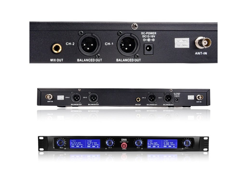 Stacja bazowa systemu DNA WM4 VOCAL SET jest wyposażona w 2 bardzo czułe anteny, 4 zbalansowane wyjścia mikrofonowe typu XLR i niezbalansowane wyjście audio 6,3 mm mono jack. Z przodu znajduje się panel sterowania z 2 dużymi, czytelnymi wyświetlaczami LCD i 4 potencjometrami do niezależnej regulacji głośności każdego mikrofonu. Wszystkie parametry pracy systemu są dobrze widoczne i można je łatwo i szybko konfigurować. Dodatkowo całą stację bazową można zamontować w szafie rack. Jest to bardzo wygodne rozwiązanie, które dodatkowo chroni odbiornik podczas pracy w terenie oraz ułatwia transport i przechowywanie urządzenia.