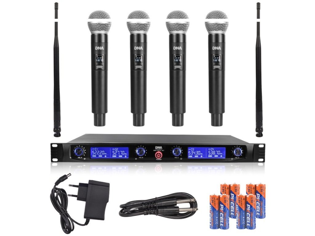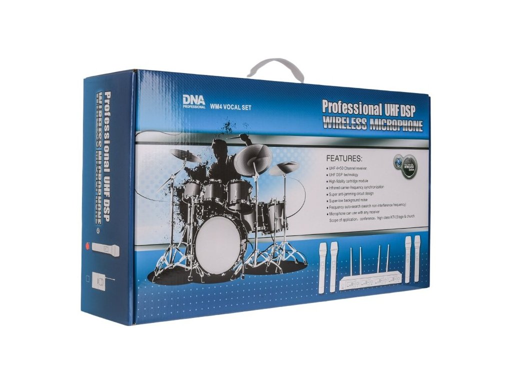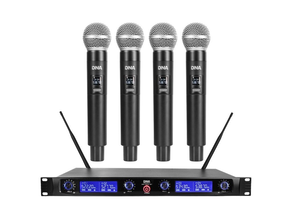 DNA WM4 VOCAL SET to profesjonalny bezprzewodowy system mikrofonowy UHF, który składa się z 4 bezprzewodowych mikrofonów dynamicznych i kompaktowego odbiornika z kolorowym wyświetlaczem LCD. Ten zestaw mikrofonowy jest idealny dla wokalistów i śpiewaków, chórów, zespołów muzycznych lub artystów estradowych. Nadaje się również jako zestaw mikrofonów do karaoke lub jako system mikrofonowy dla różnych typów instytucji kulturalnych i edukacyjnych.
