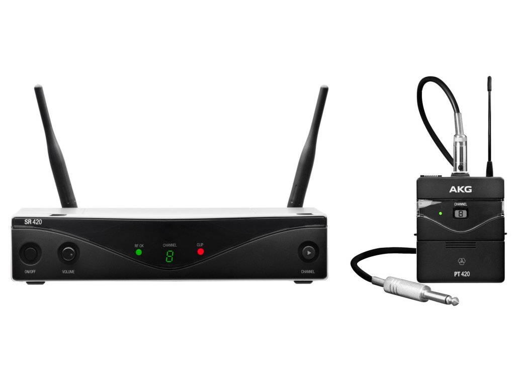 AKG WMS 420 Wireless Instrumental Set / A to bezprzewodowy system pracujący w paśmie A (530,025 do 559,000 MHz), który zawiera odbiornik AKG SR420, nadajnik bodypack AKG PT420 i kabel instrumentalny MKG L (jack/mini XLR).