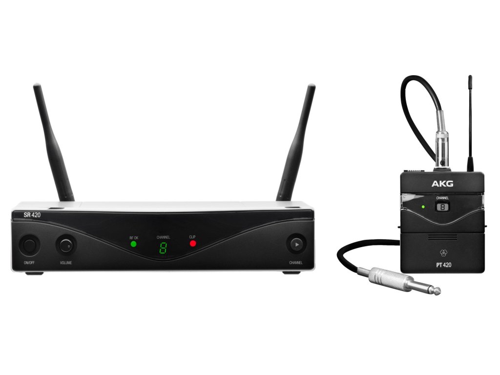 AKG WMS 420 Wireless Instrumental Set / A to bezprzewodowy system pracujący w paśmie A (530,025 do 559,000 MHz), który zawiera odbiornik AKG SR420, nadajnik bodypack AKG PT420 i kabel instrumentalny MKG L (jack/mini XLR).