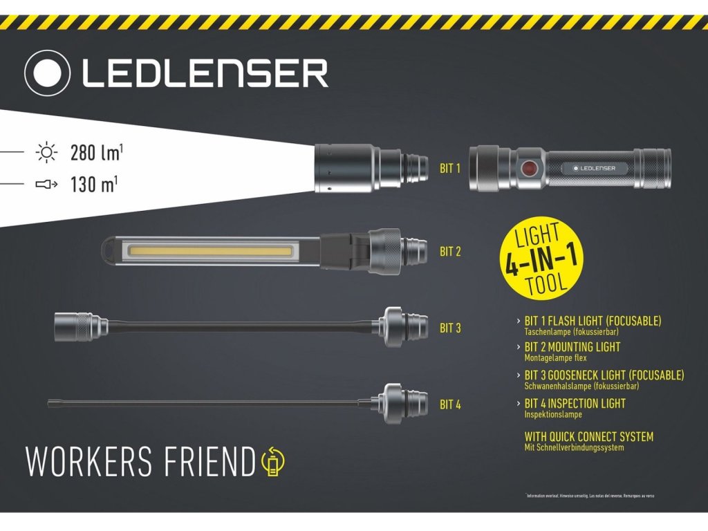 The Workers Friend firmy Ledlenser to więcej niż tylko latarka. Ten kompleksowy system zawiera cztery różne lampy, które doskonale radzą sobie z najróżniejszymi wymaganiami. W trudno dostępnych przestrzeniach, w silniku, w rurach, a nawet za rogiem - bez względu na to, gdzie chcesz doprowadzić i użyć światło, Workers Friend jest zawsze właściwym narzędziem, które możesz zabrać ze sobą. Szczególnie dla mechaników, majsterkowiczów, techników lub zarządców obiektów Workers Friend będzie bardzo użytecznym towarzyszem. Uniwersalność tej multifunkcyjnej latarki będzie również przydatna dla zwykłych użytkowników. Ta latarka zawiera podstawowy korpus z magnetycznym uchwytem i w sumie cztery różne, łatwo wymienne głowice do świecenia.