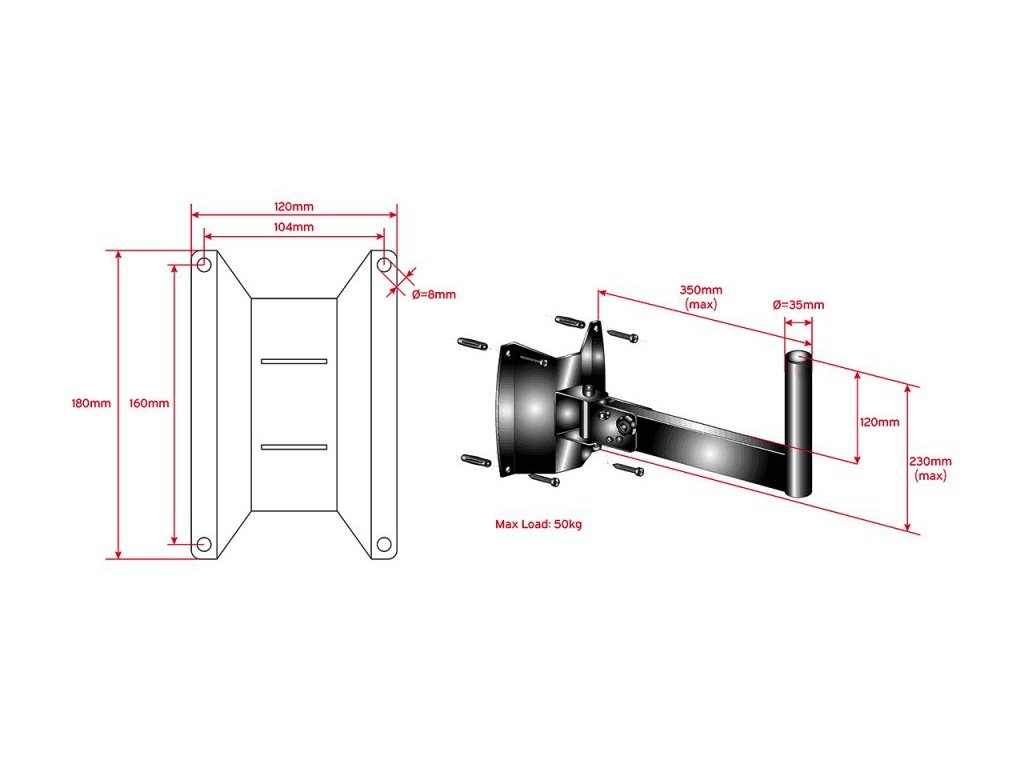 - Wymiary podstawy do mocowania na ścianie: 120 x 180 mm