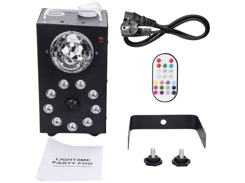 - W zestawie: Wytwornica Party Fog 700W, kabel zasilający, uchwyt montażowy, krótka instrukcja