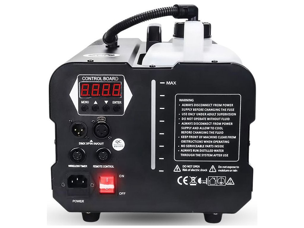 Light4Me Pro Fog 2500W jest wyposażony w czytelny wyświetlacz z 4 przyciskami, za pomocą których możemy łatwo sterować menu urządzenia. Za jego pomocą możemy ustawić intensywność wytwarzanej mgły i parametry czasowe, na przykład interwał między wytryskami mgły lub czas ciągłego zamgławiania. Wytwornicę mgły można również podłączyć do sterownika DMX i za jego pomocą ustawić intensywność wytwarzanej mgły. Dodatkowym ułatwieniem jest wskaźnik objętości płynu, dzięki któremu łatwo można sprawdzić, kiedy należy uzupełnić płyn w wytwornicy.